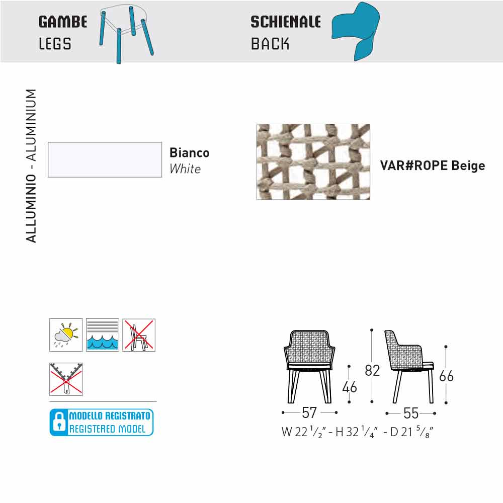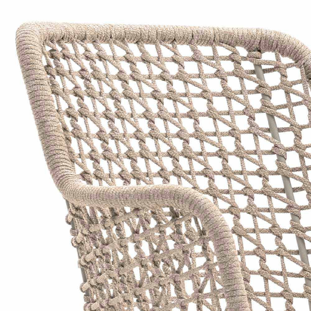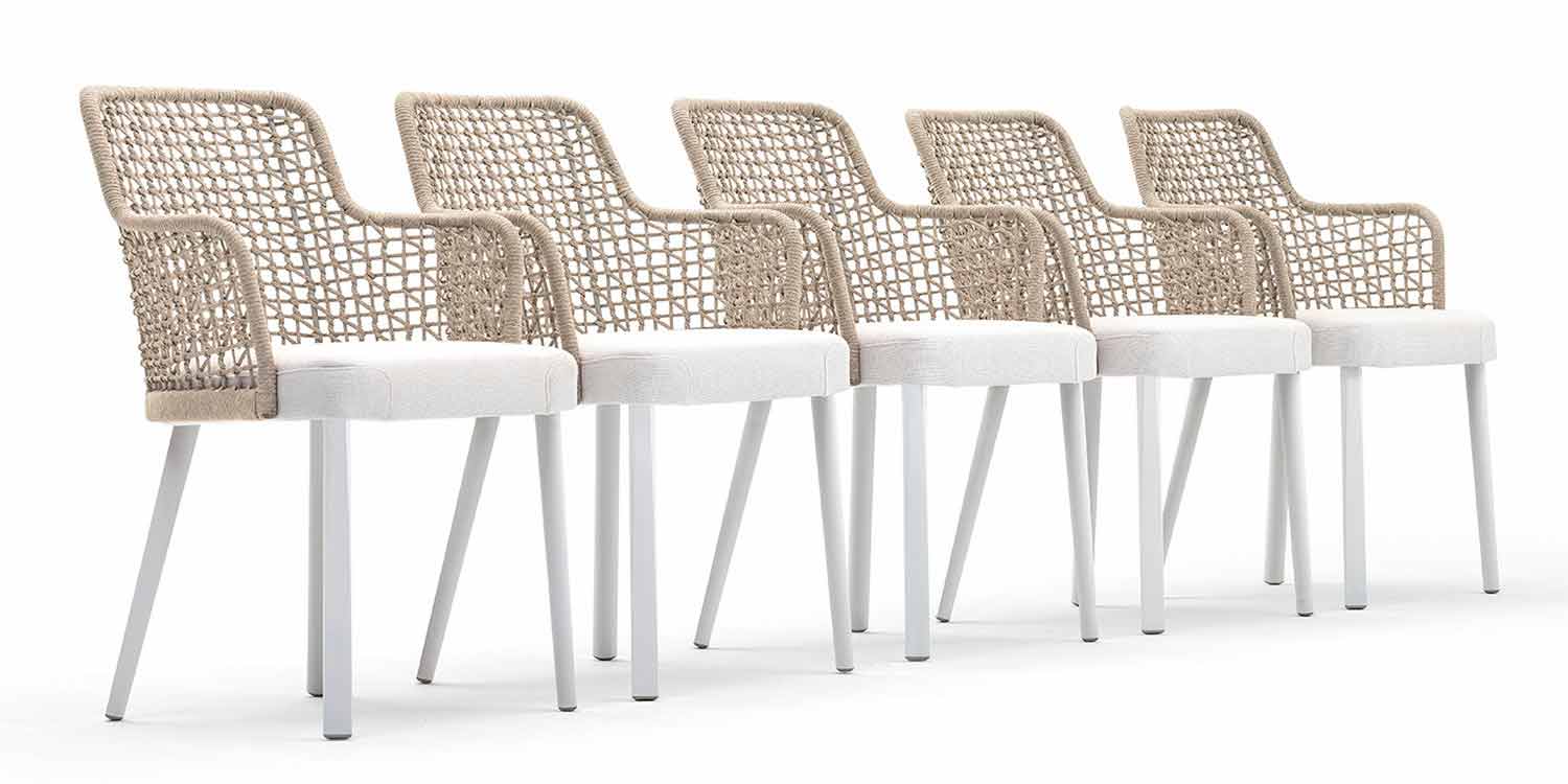Emma ist ein Gartensessel mit einer syntaktischer Faserstruktur, die von Hand gewebt ist und mit einem pulverbeschichteten Aluminiumrahmen in beige lackiert.