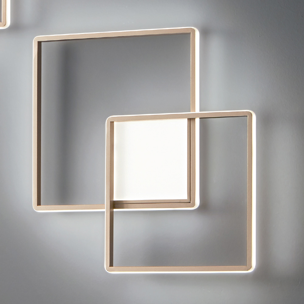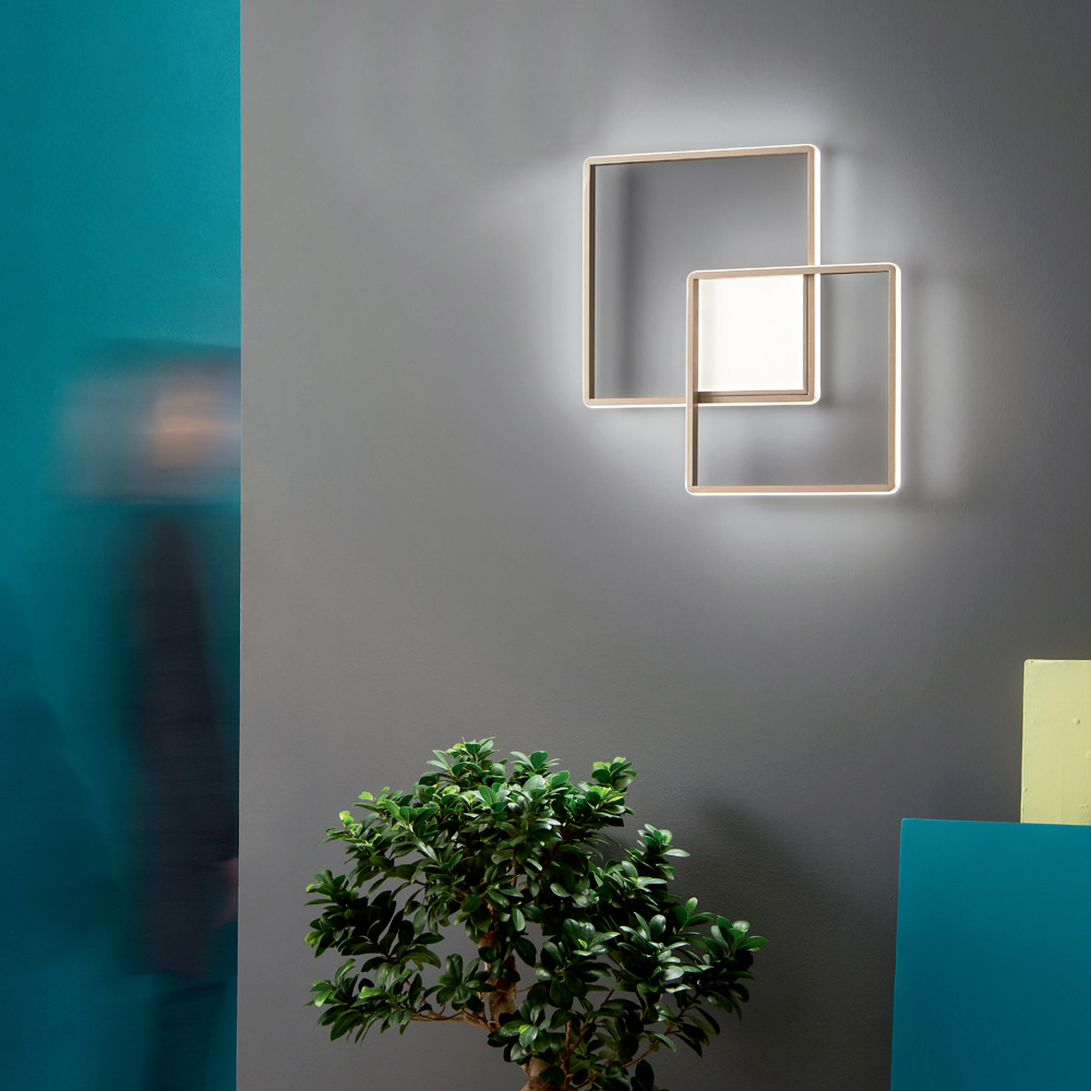 Moderne LED-Wandleuchte aus goldfarben lackiertem Metall.