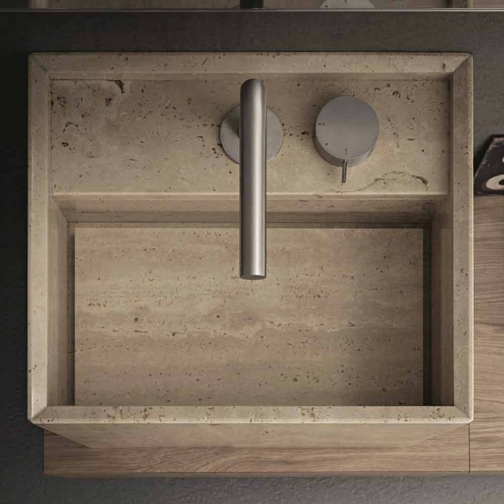 Waschtischplatte aus Stein in harzbeschichtetem Travertin-Finish mit Hahnloch, ohne Überlaufloch, Abfall ausgeschlossen.