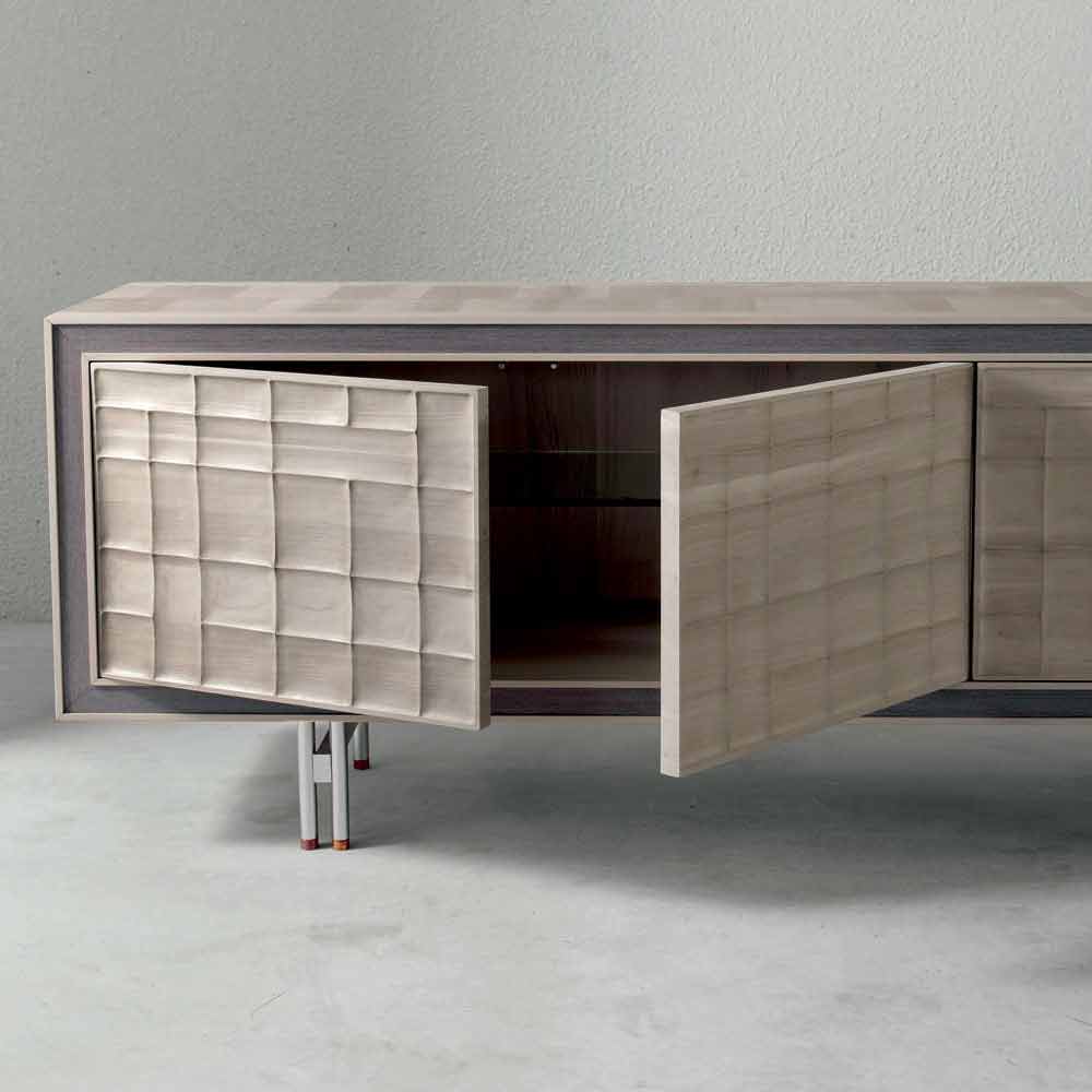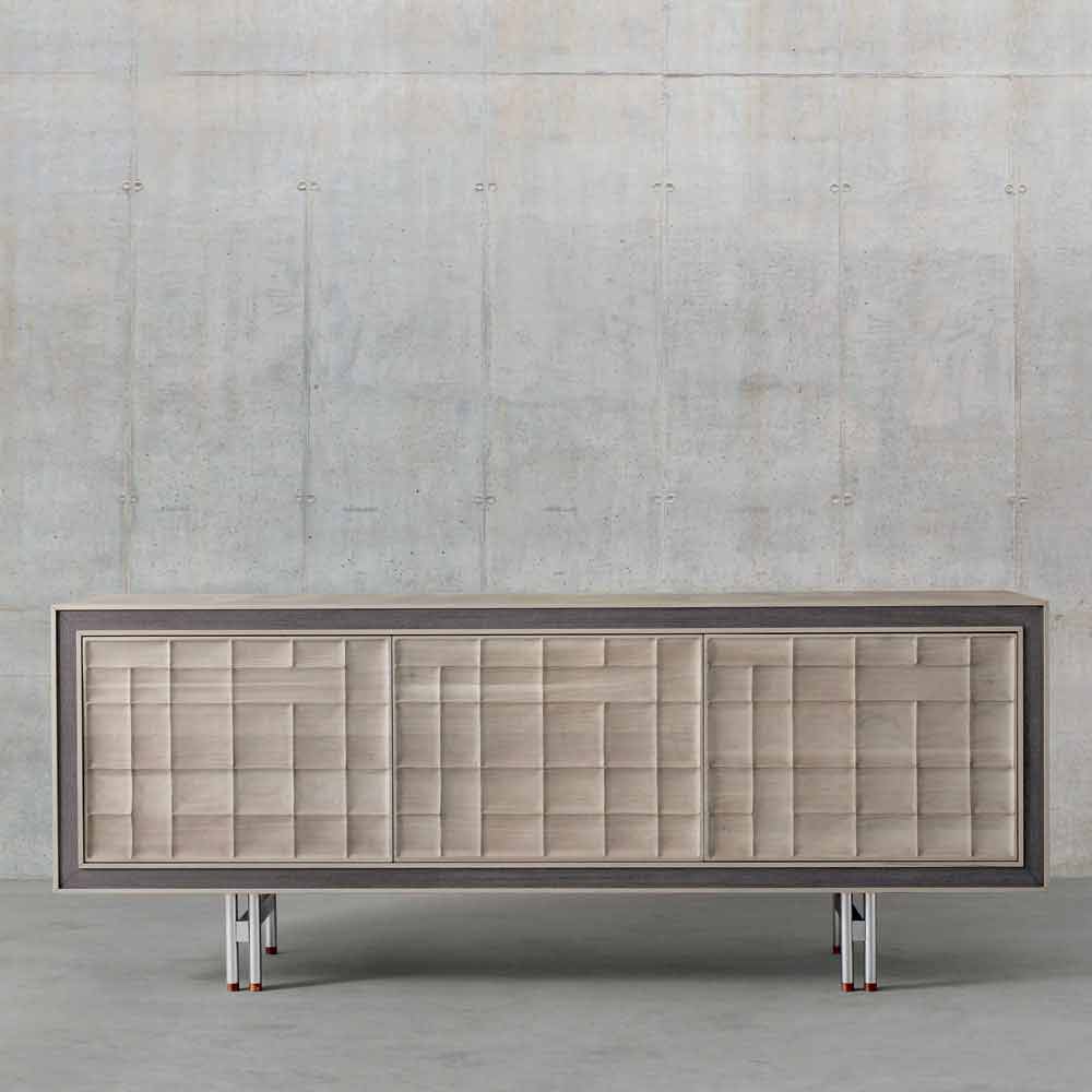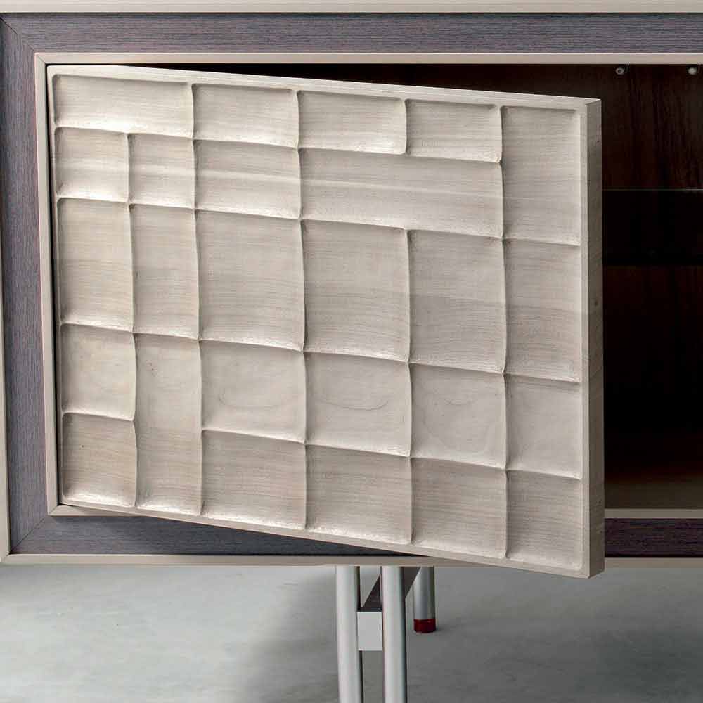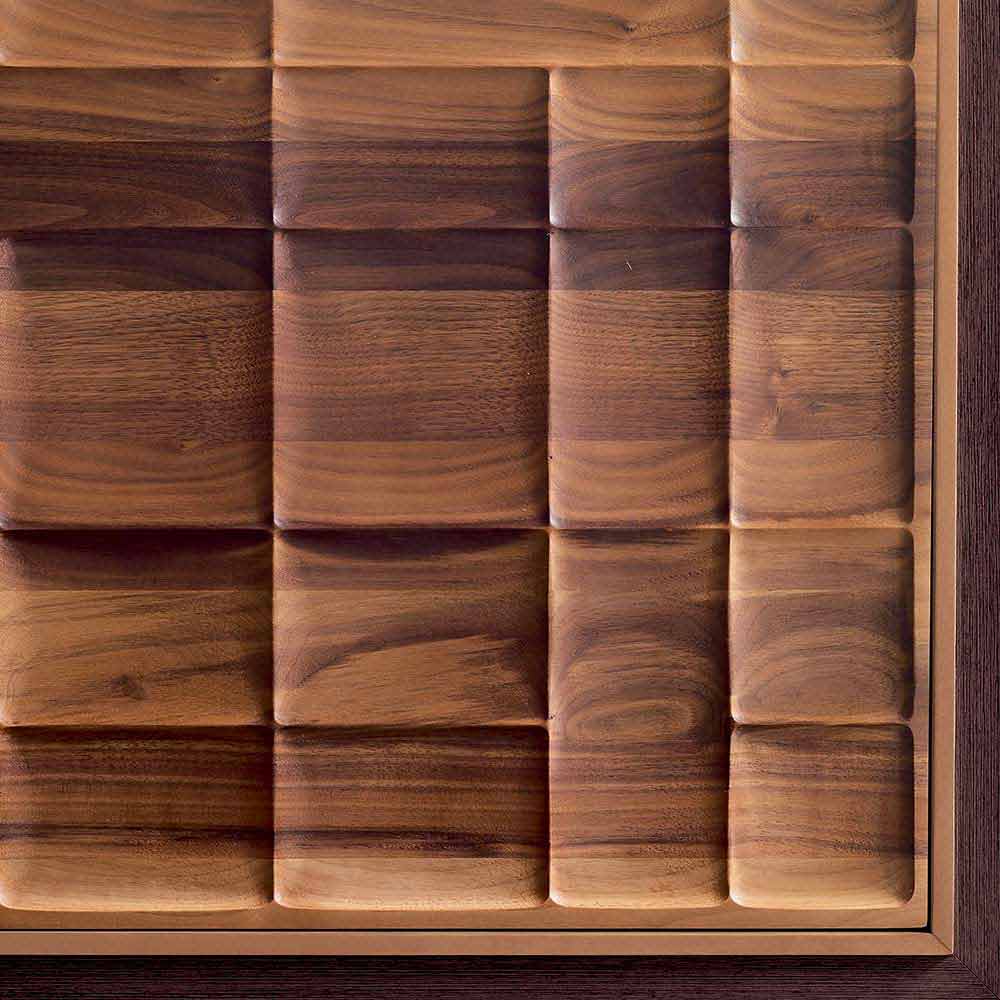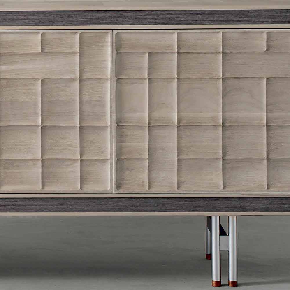 Das Spiel der Lichter und Schatten, das durch die besondere Verarbeitung der Türen erzeugt wird, erinnert an die Traditionen, um sie in ein zeitgenössisches Werk zu verwandeln. Die Essenz aus Walnussholz verstärkt das formale Gleichgewicht des wertvollen dreitürigen Sideboards.
