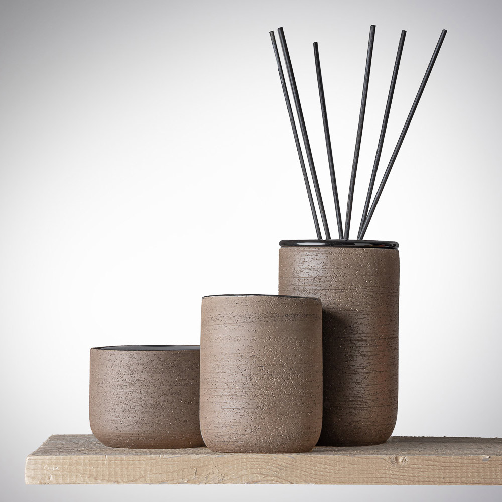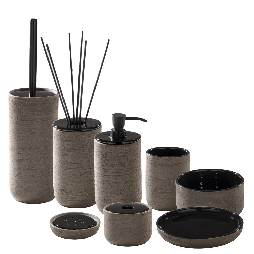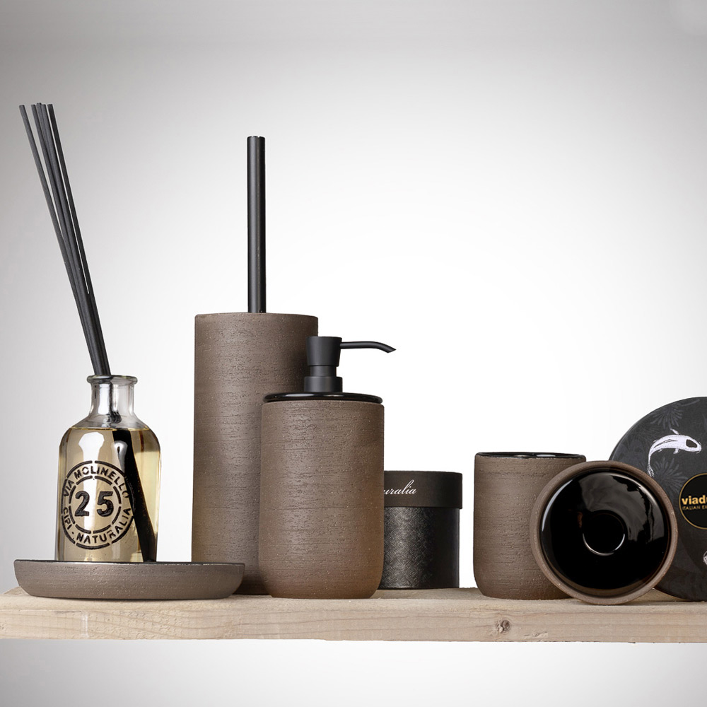 Badaccessoires für die Waschtischplatte aus Ton und dunkler Erde Made in Italy.
