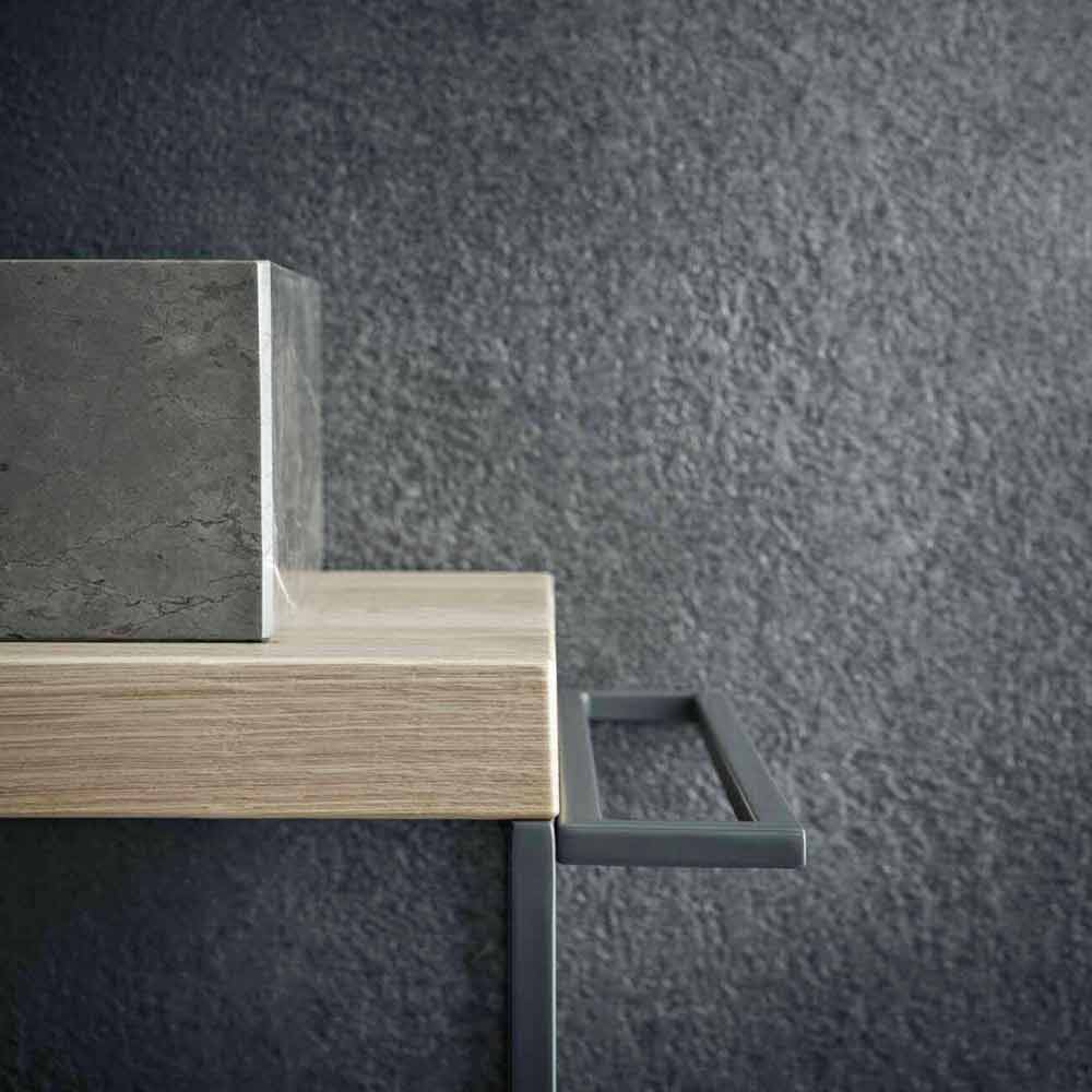 Die Komposition besteht aus natürlicher geknoteter Eiche , Waschbecken aus grauem Stein , Metallstrukturen aus mattem dunkelgrauem Lack. Schrankwand in mattem dunkelgrauem Lack.