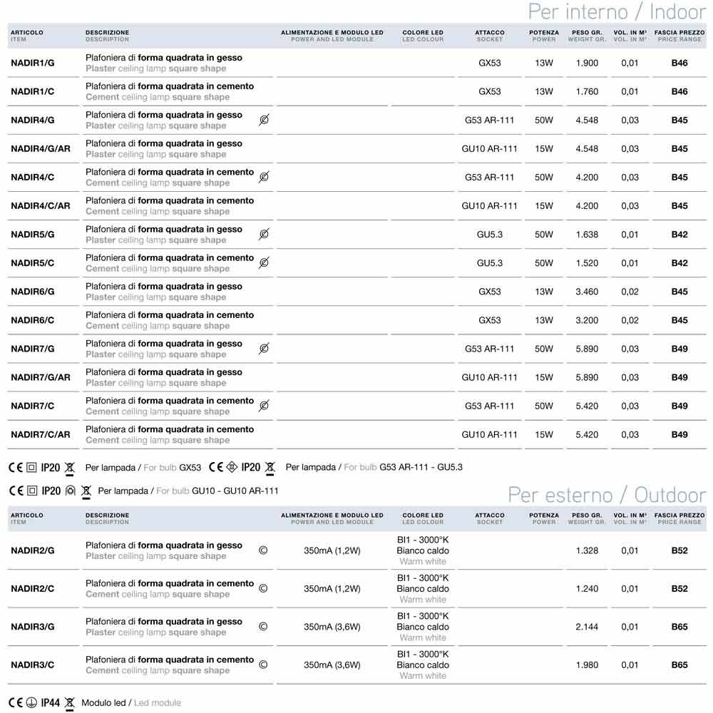 Moderne quadratische Deckenleuchte Nadir von Aldo Bernardi , erhältlich in der Beton- oder Gipsversion.
