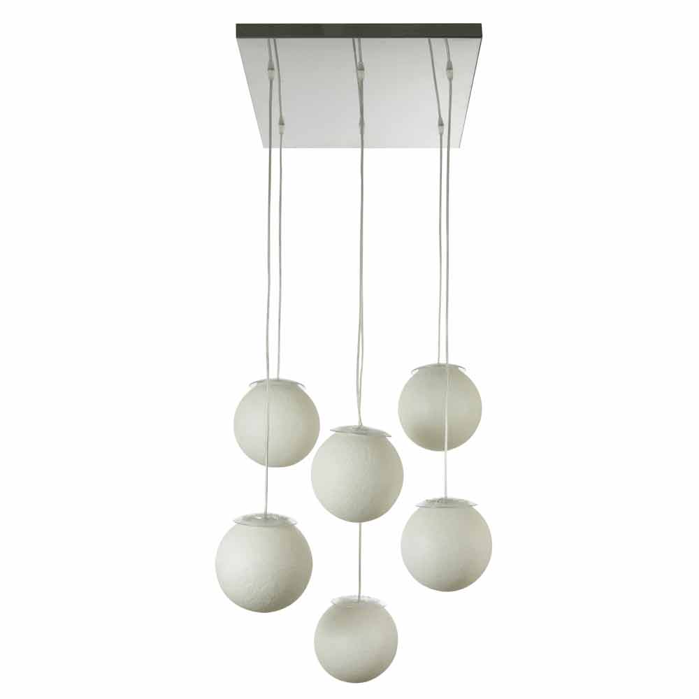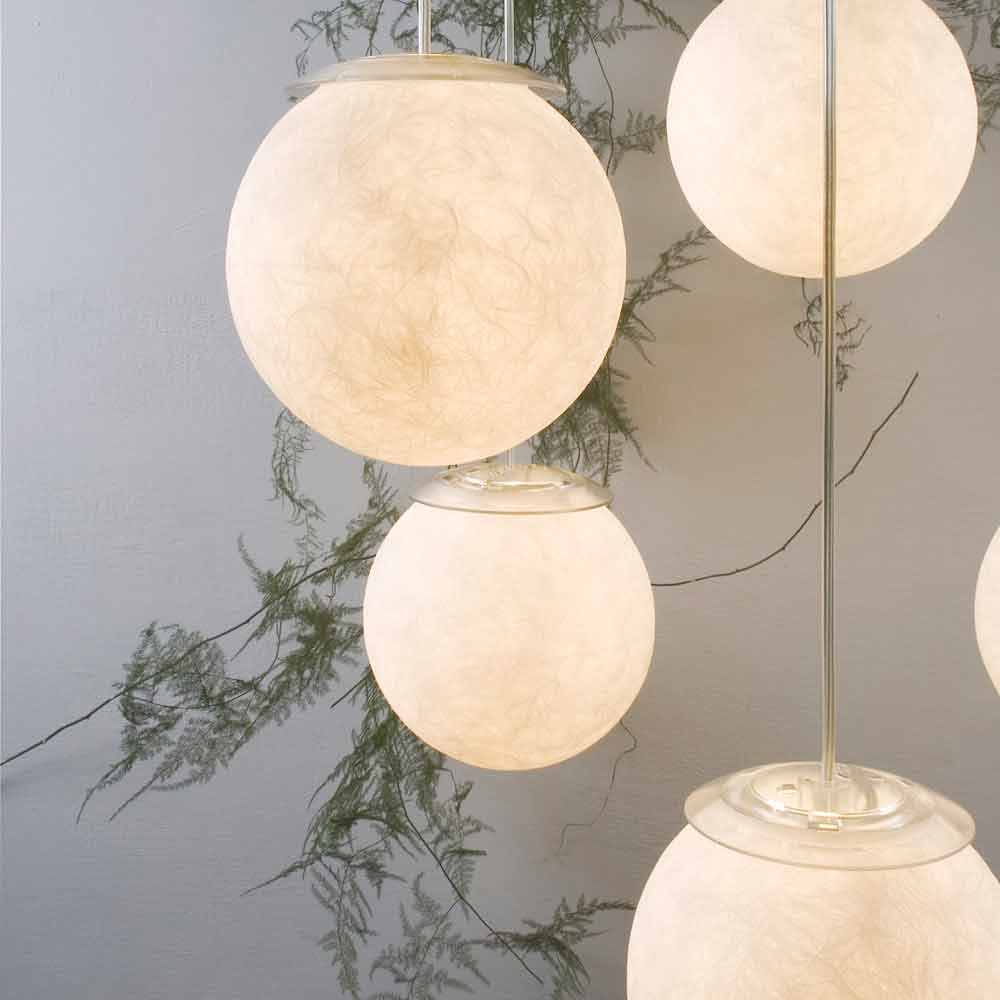 Es besteht aus einer Stahlstruktur und sechs Kugeln aus Nebulite®, einem Material aus Harz und Fasern, dessen Adern der Lampe einen besonderen Mondeffekt verleihen.