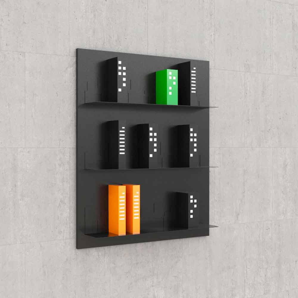 Wolkenkratzer verteilen die 3 Regale und können auche als Bücherhalter ausbenutzt werden. Eine originale und funktionale Idee um Ihre Büro oder Wohnung einrichten.