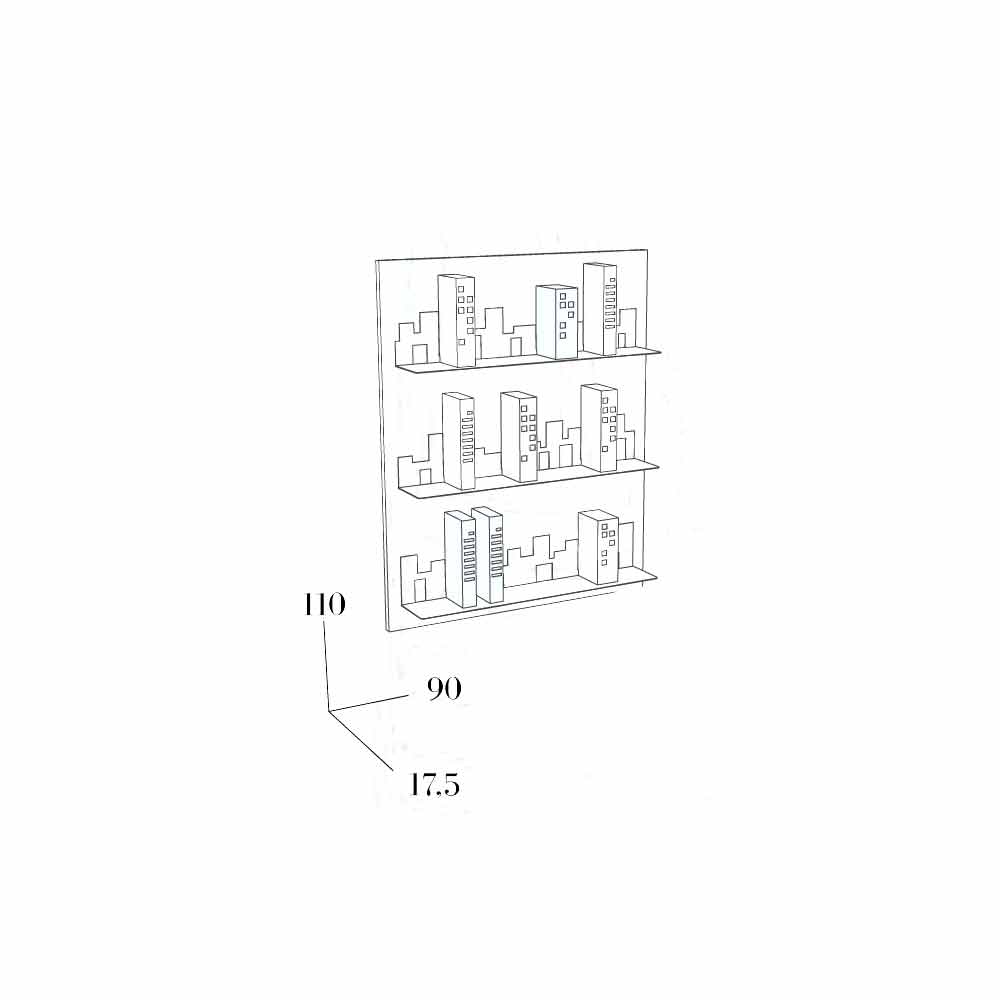 Ein Bücherschrank aus lackiertem Eisen, die nicht nur als Bücher behälter benutzt wirt, aber ein richtiges Dekor Zubehör. Wie ein Bild auf der Wand, Skyline wiederstellt das Profil eines modernes Metropole: seine