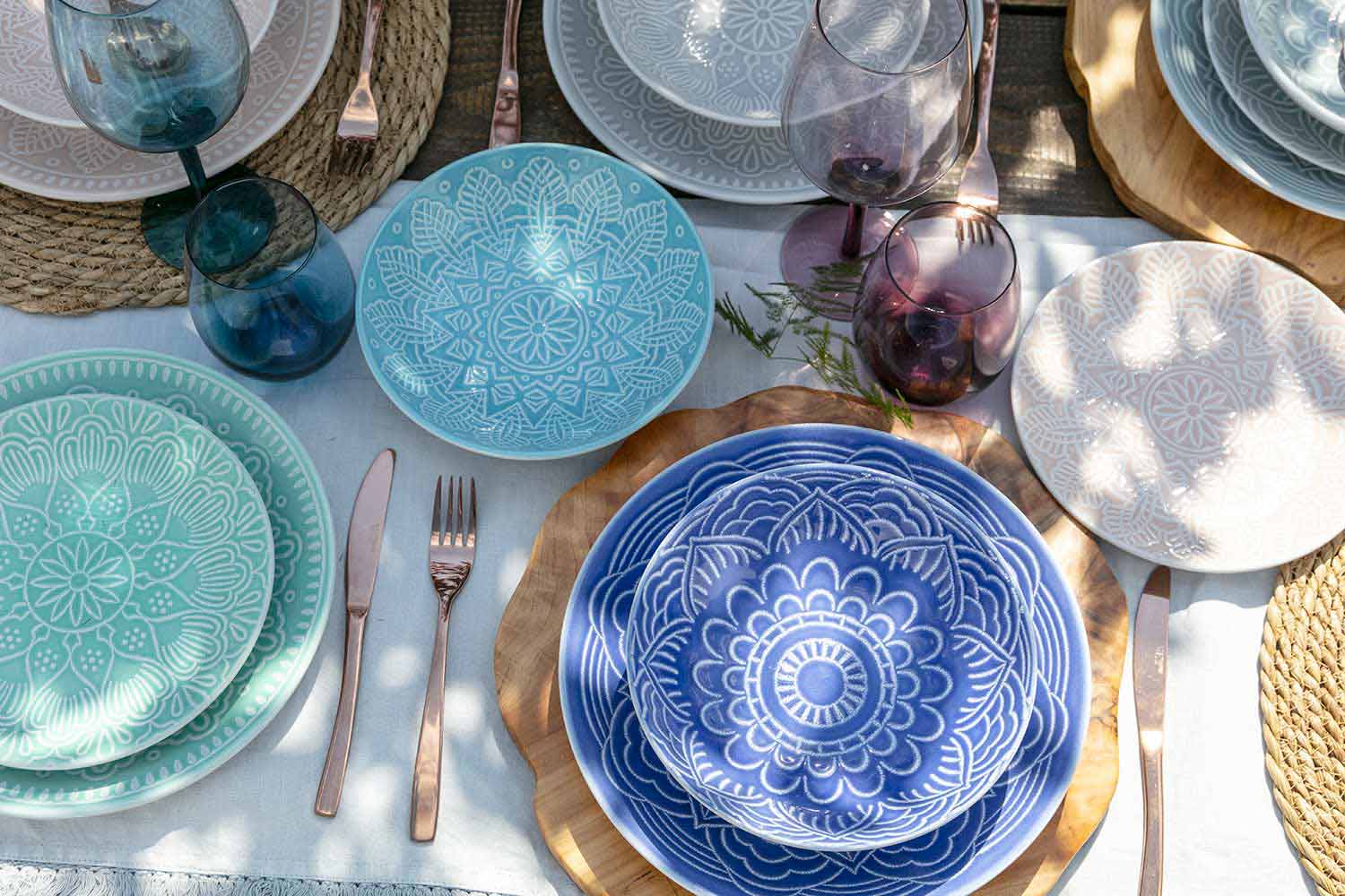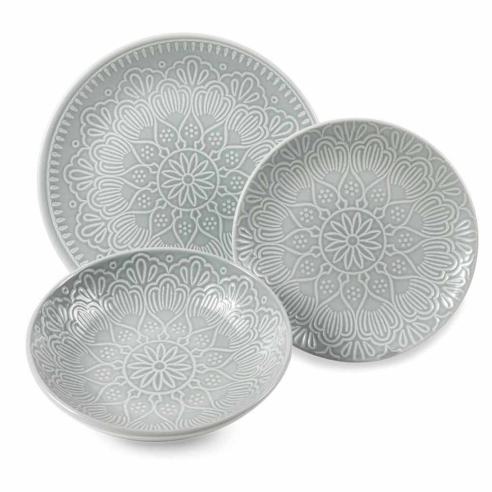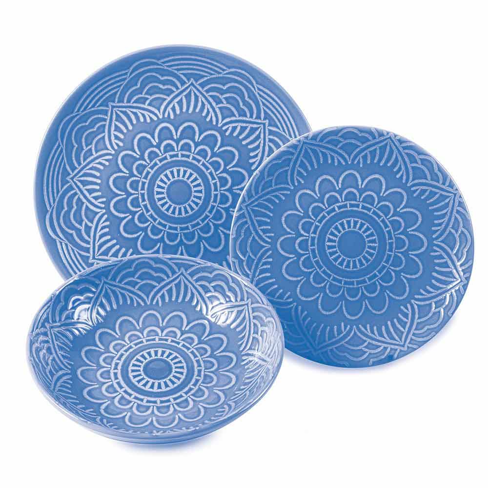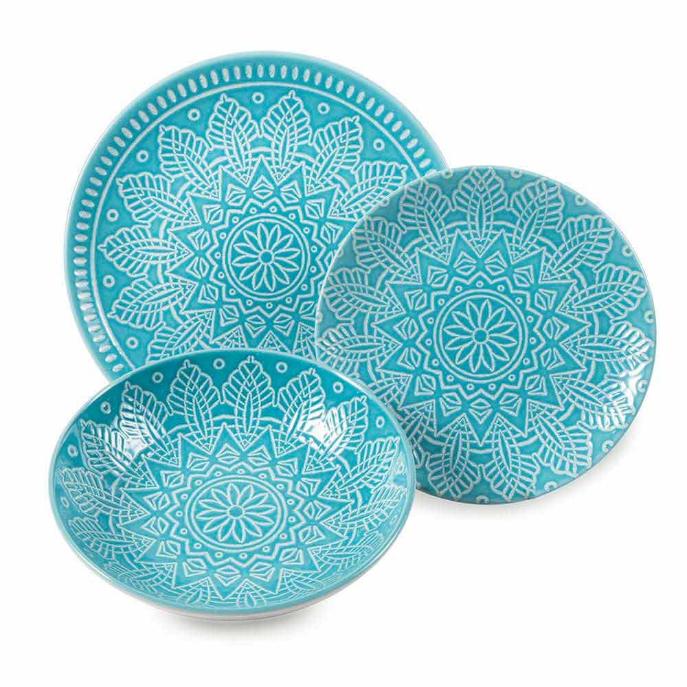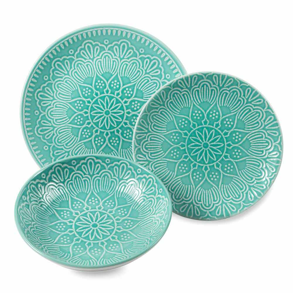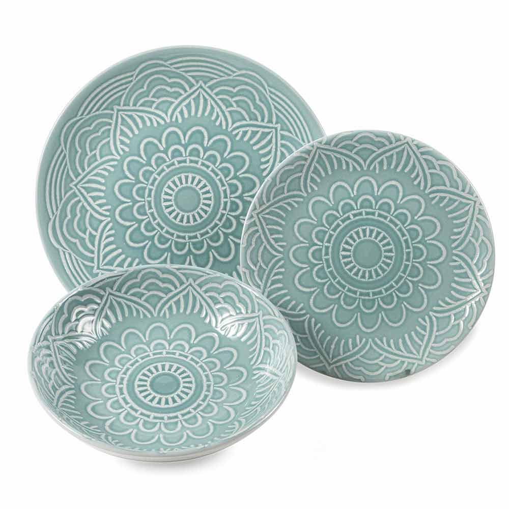 Set aus farbigem und modernem Steinzeug mit 18-teiligem Designgeschirr.