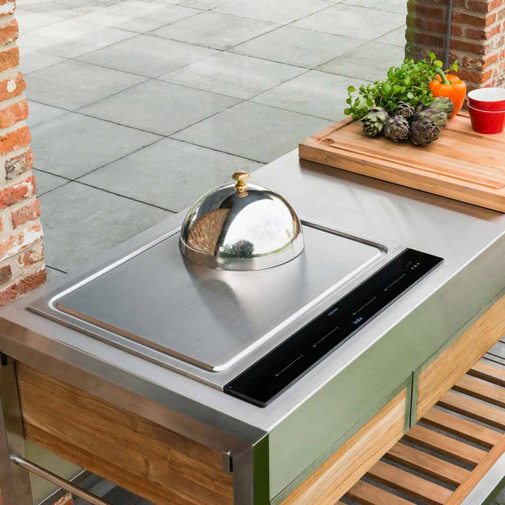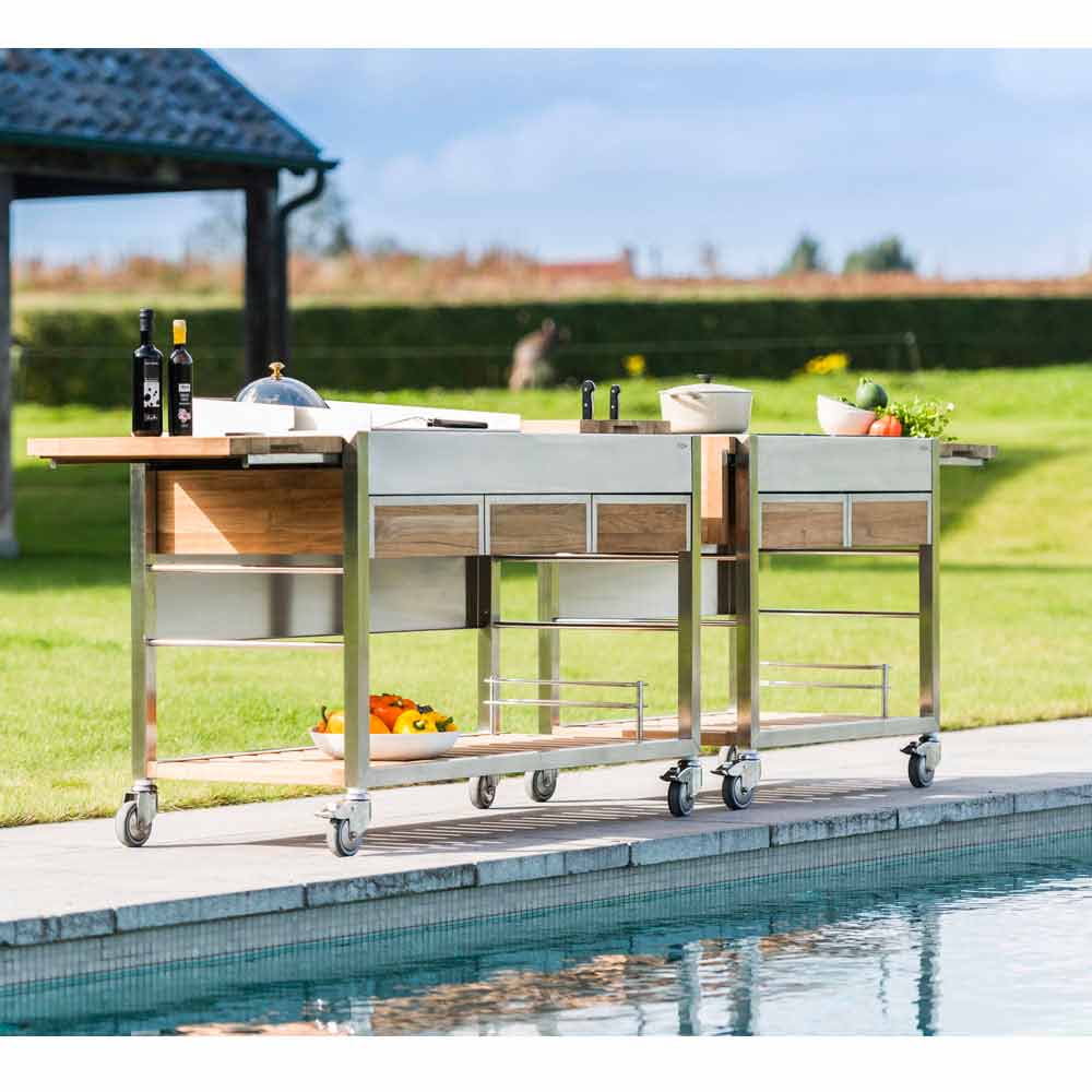 Outdoor-Küche auf Rädern aus Edelstahl und Teakholz, zwei Größen in modernem Design mit austauschbaren Platten.