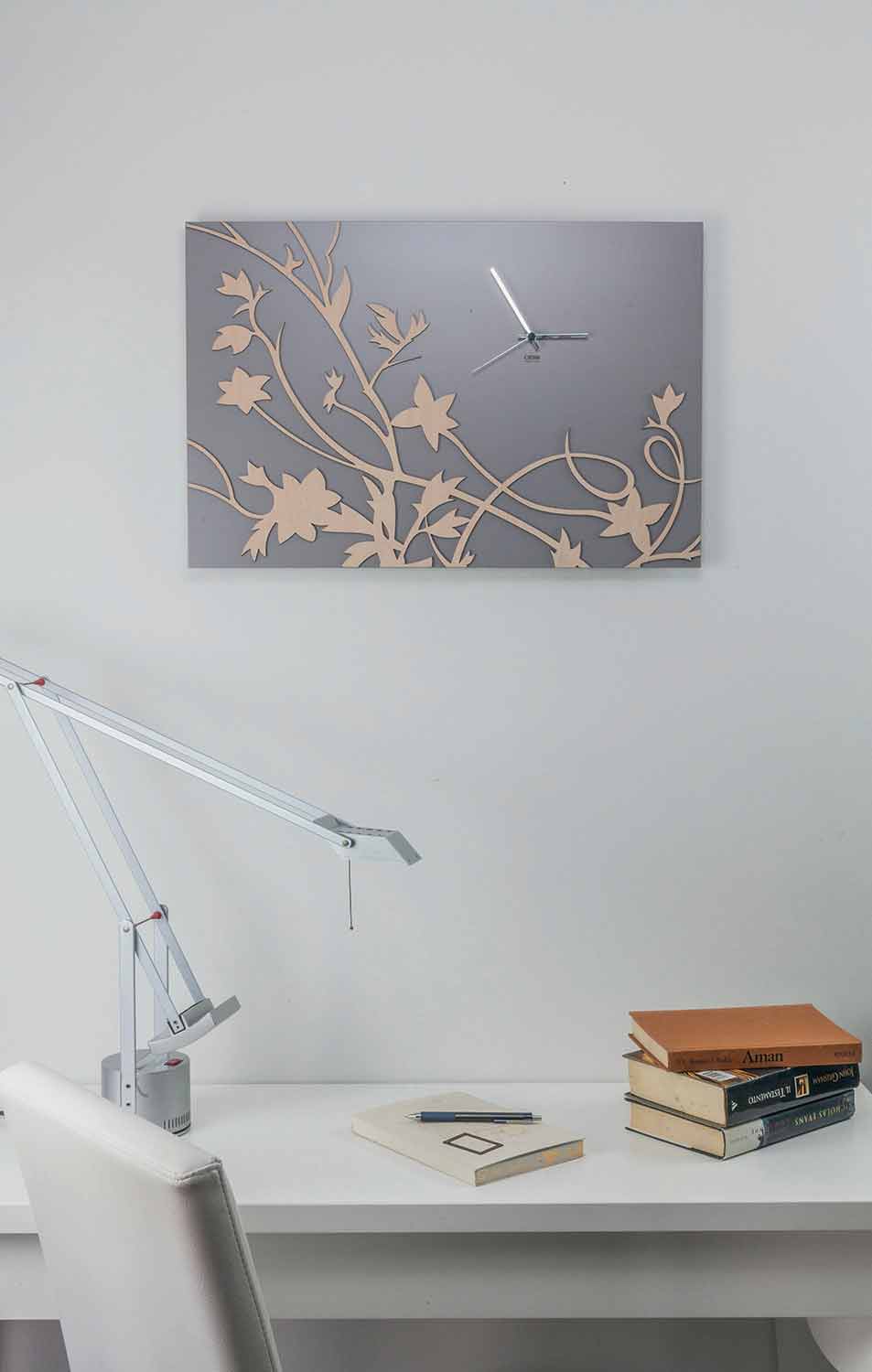 Große Wanduhr mit rechteckigem und modernem Design aus grauem und dekoriertem Holz, hergestellt in Italien.