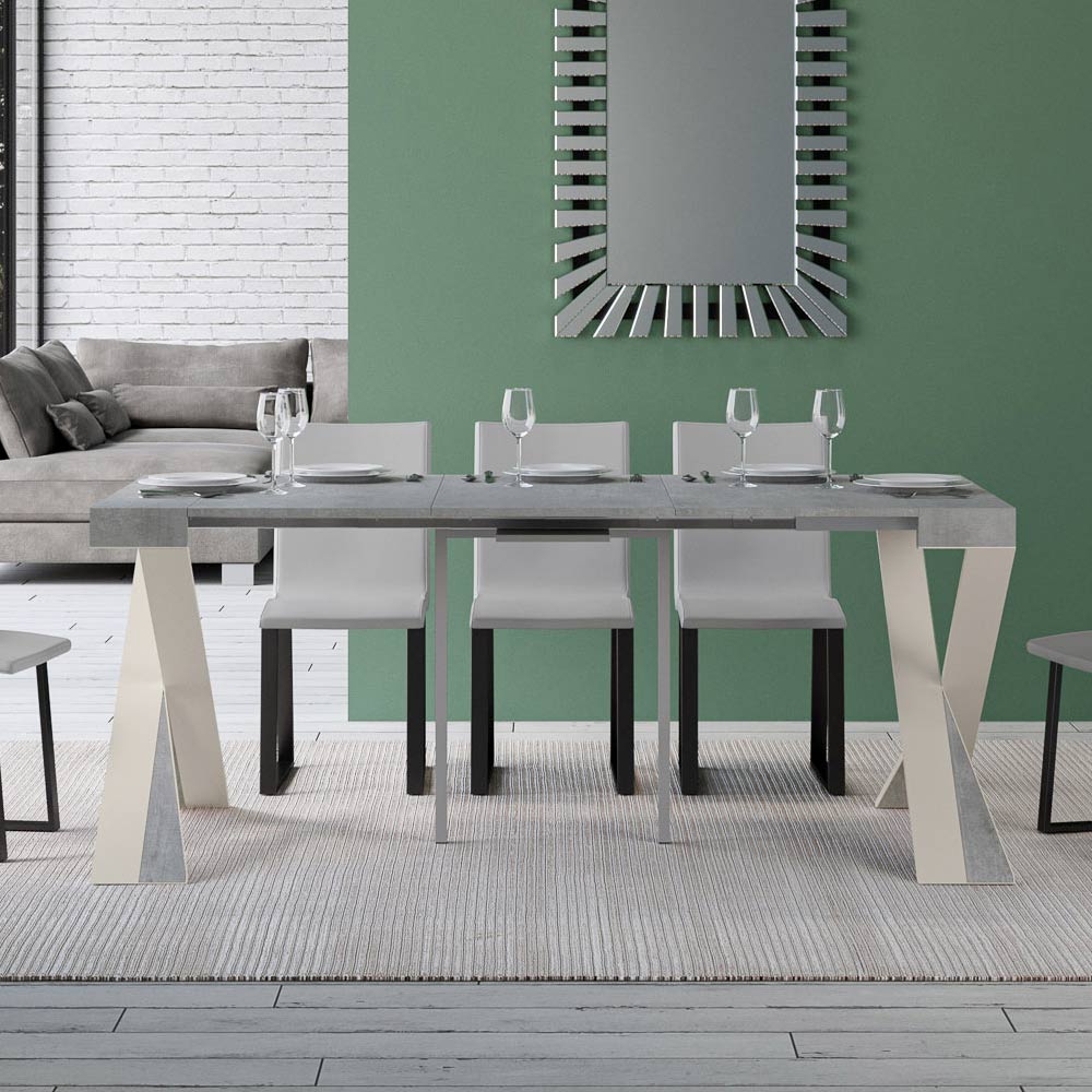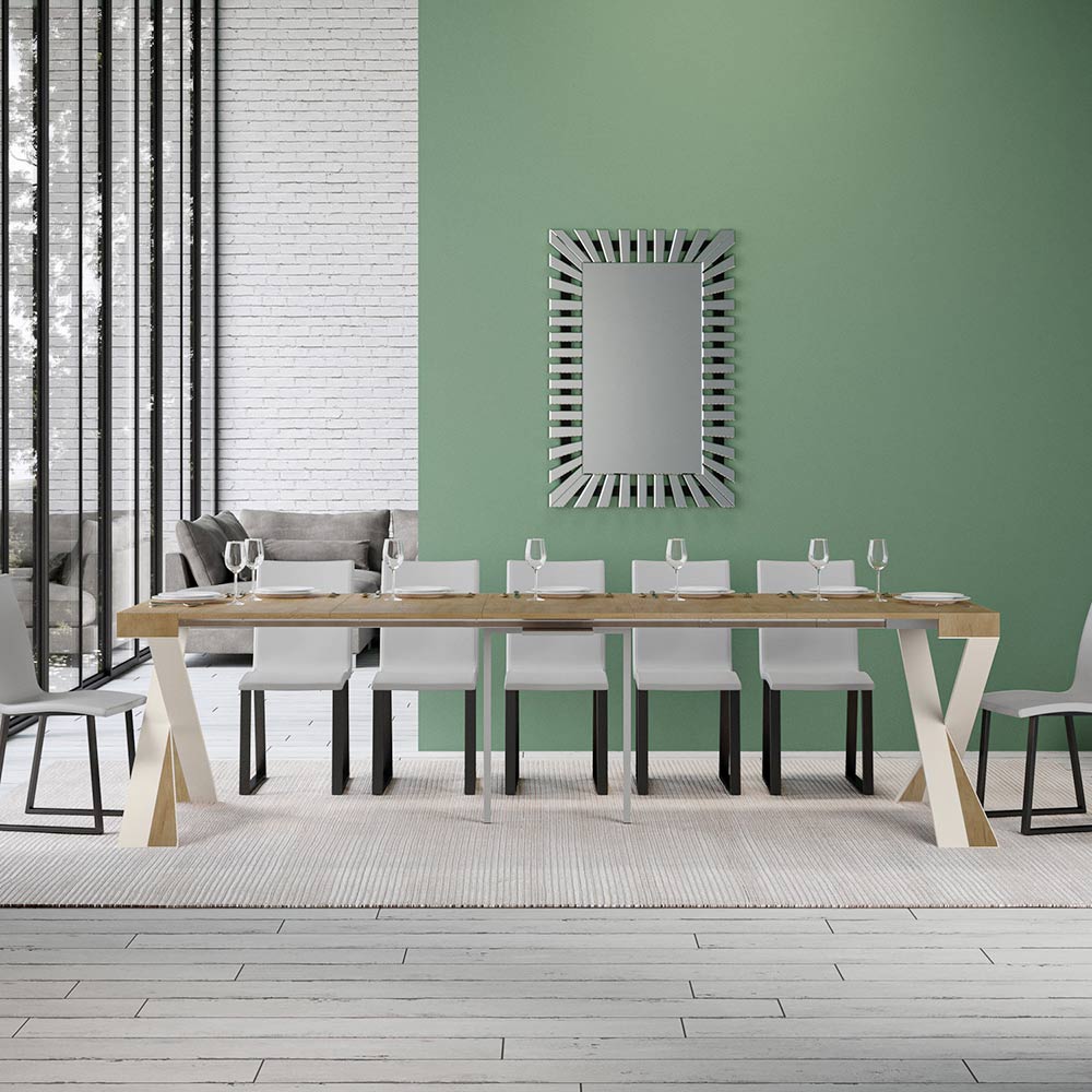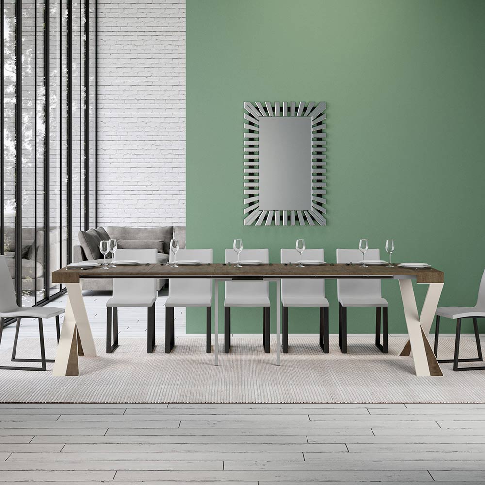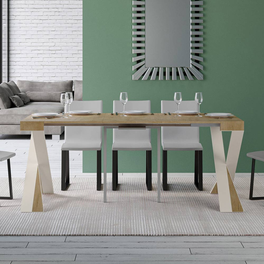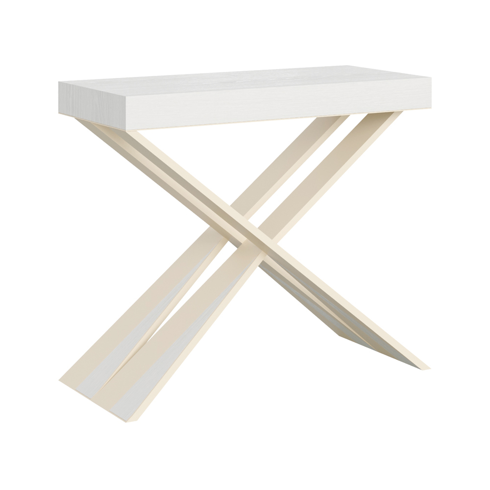 Dieser ausziehbare Konsolentisch verkörpert Eleganz und Funktionalität in einem aufsehenerregenden Design. É hat eine moderne Silhouette mit einem X-Fuß, der nicht nur eine solide Stütze bietet, sondern auch einen Hauch von raffinierter Originalität verleiht. Die Platte aus Möbelholz ist eine Hommage an die Qualität von Made in Italy, die für ihre Langlebigkeit und ihre Fähigkeit, den Lauf der Zeit zu überdauern, geschätzt wird.