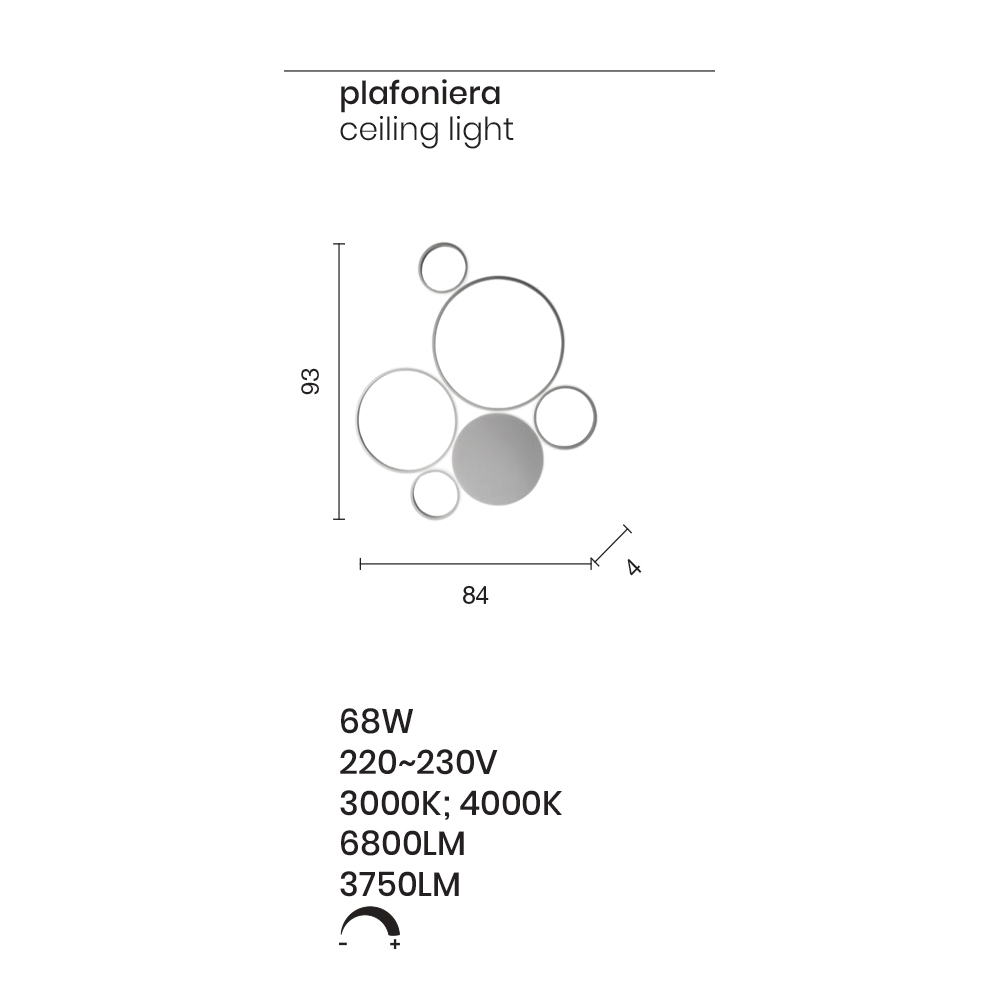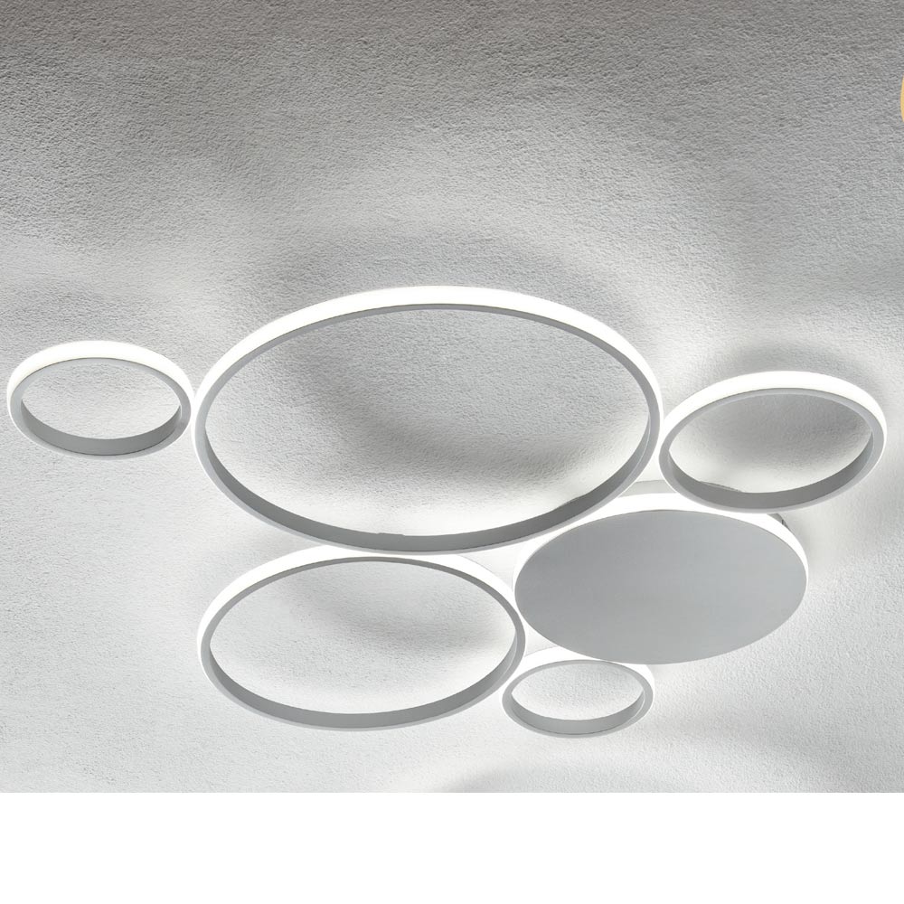 LED-Quelle. Eine originelle Komposition aus Kreisen unterschiedlicher Größe, die zusammengefügt und außen von einem milchig-weißen Diffusor bedeckt sind, der den LED-Streifen umschließt und wunderbare Lichteffekte an den Wänden für ein Ergebnis mit