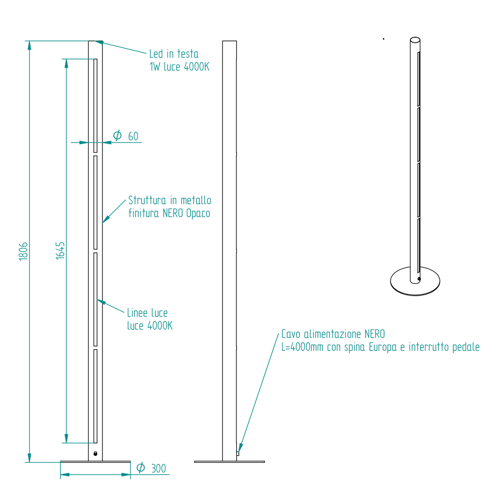 Diese Stehleuchte besteht vollständig aus Metall und ist mit einer doppelten vertikalen Beleuchtung und einem Lichtpunkt im oberen Teil ausgestattet.