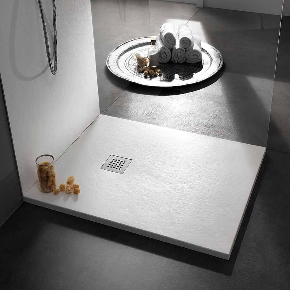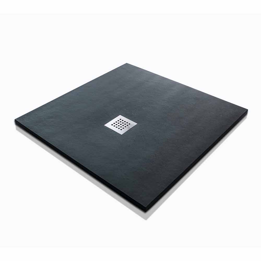 Quadratische Duschwanne 90x90 in Steinoptik mit Stahlgitter.