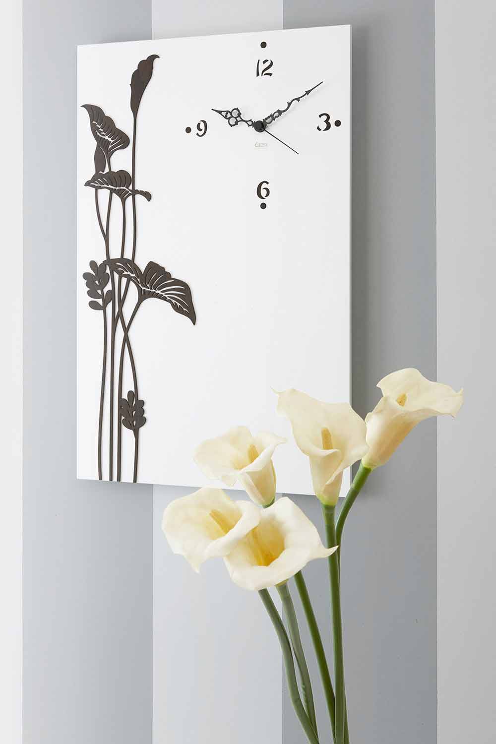 Weiße Wanduhr mit Dekorationen, modernes Holzdesign hergestellt in Italien.