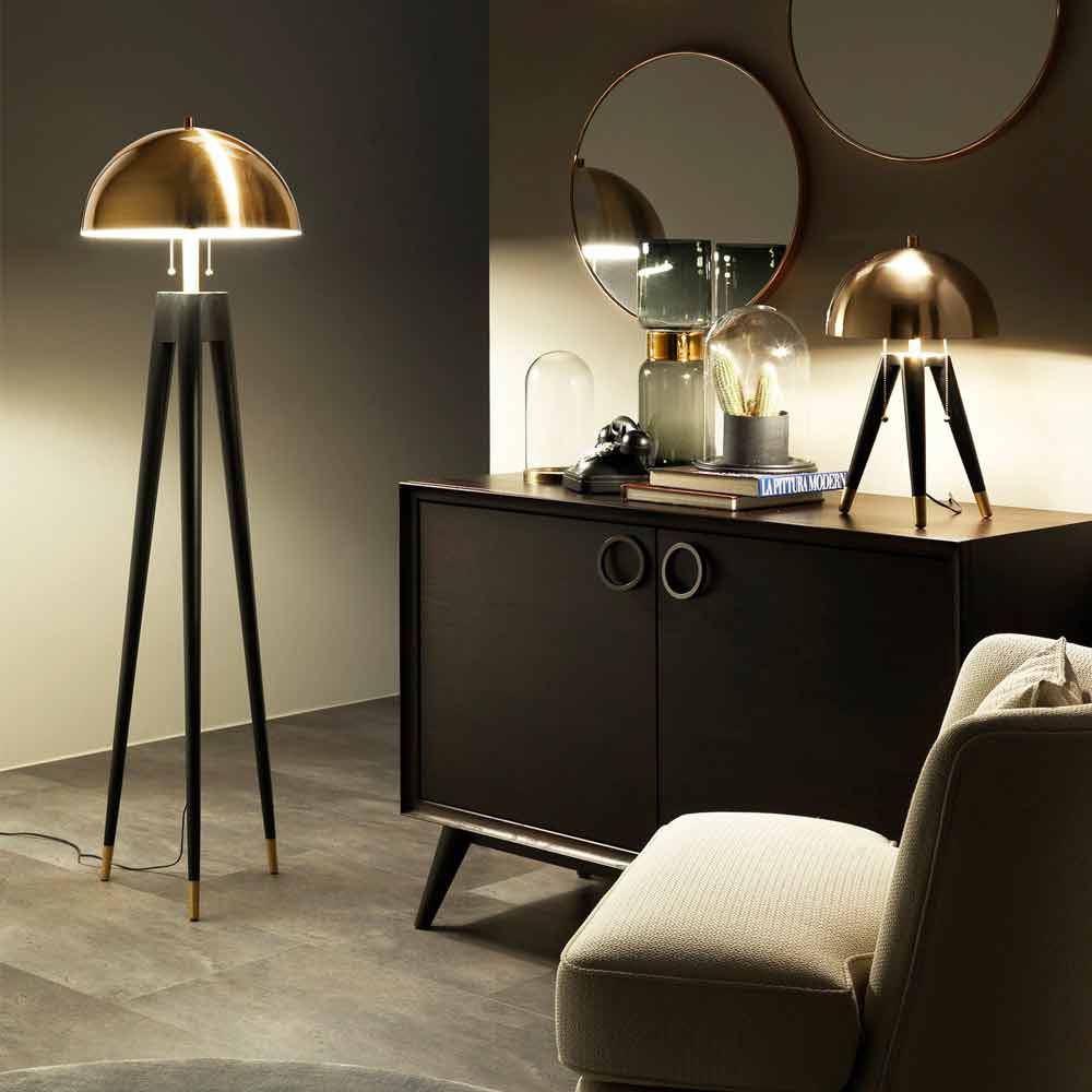 Diese Stehlampe besteht aus einer schwarzen Metallstruktur mit einem gewölbten Lampenschirm aus gebürstetem Messing , der zu den Details an der Unterseite der 3 Stützbeine passt, ebenfalls aus Messing. Die Verwendung dieser raffinierten Geschmacksausführungen in Kombination mit einem schlichten und geradlinigen Design lässt ein Einrichtungsaccessoire mit einer starken Persönlichkeit entstehen , das nicht unbemerkt bleibt.