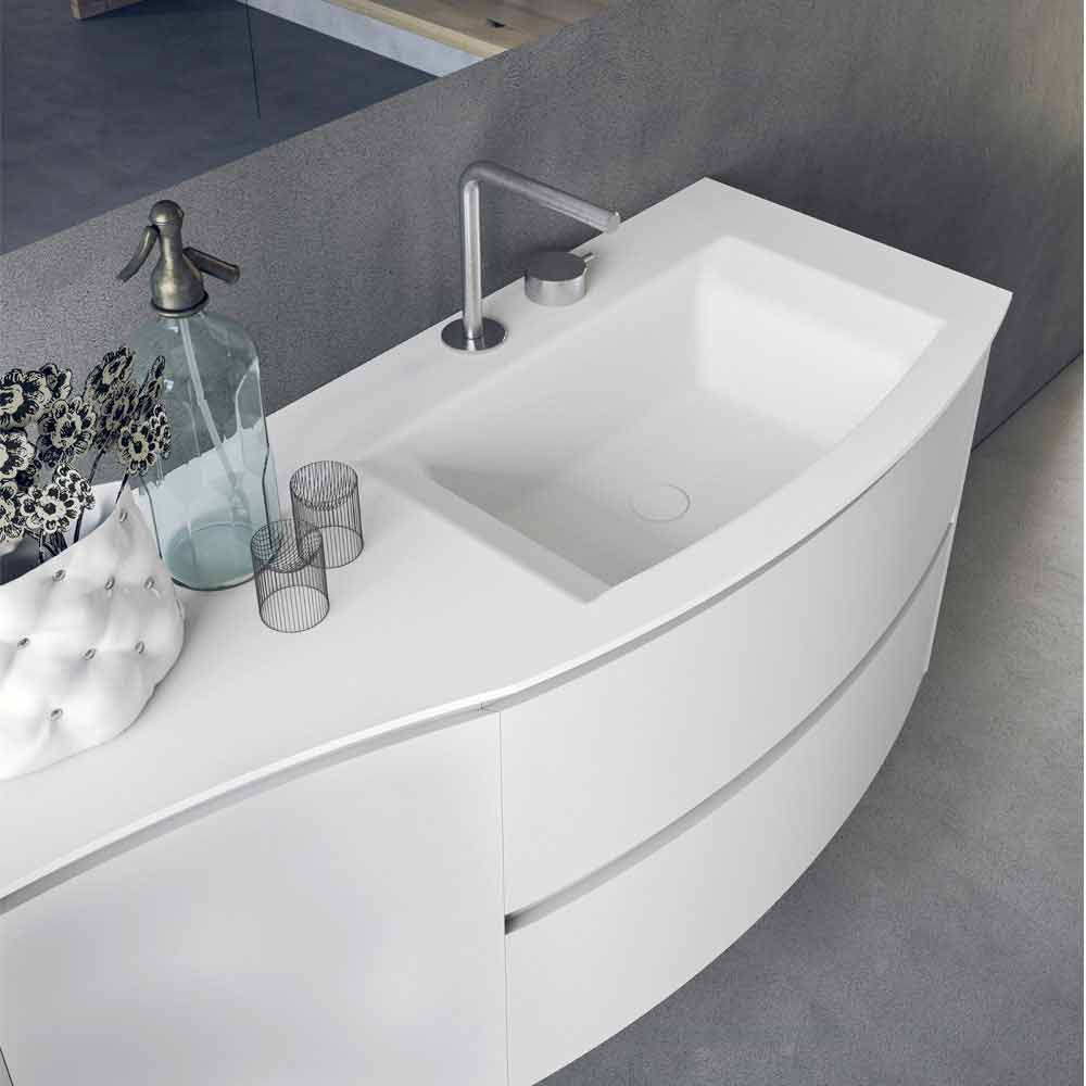 Minimale Badezimmerzusammensetzung, hängendes und geschwungenes Design mit integriertem Waschbecken, hergestellt in Italien.