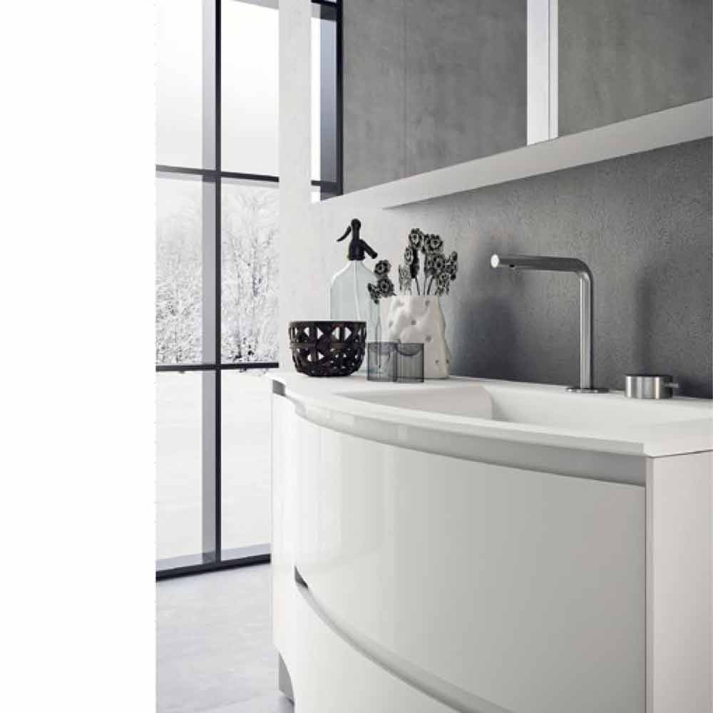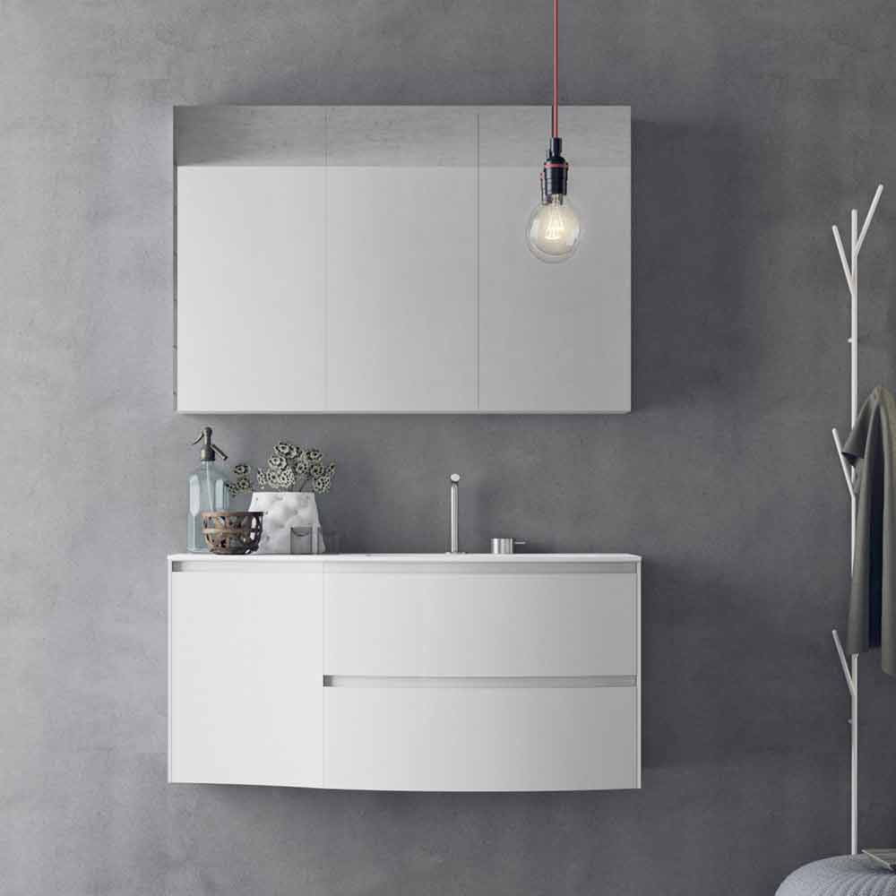 Badezimmermöbel mit polierten, weiß lackierten, geschwungenen Fronten, Waschbecken in Novcryl weiß glänzend integriert, Spiegelschrank mit 3 Türen in glänzendem Weiß.