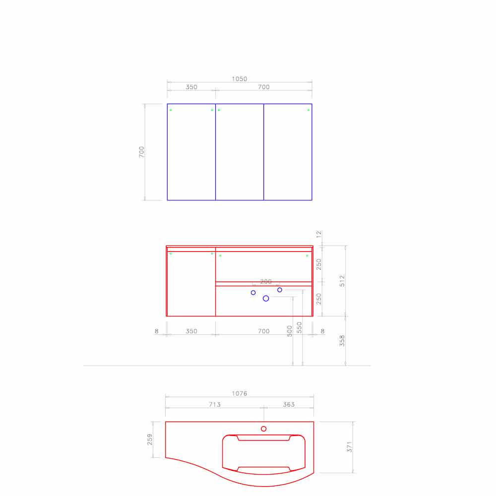 Die Besonderheit dieser Komposition ist die Silhouette des eingebauten Waschbeckens, die durch zwei seitliche Seiten gekennzeichnet ist, die sanft zum Becken hin abfallen.