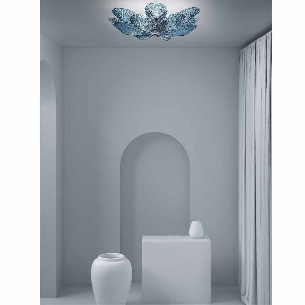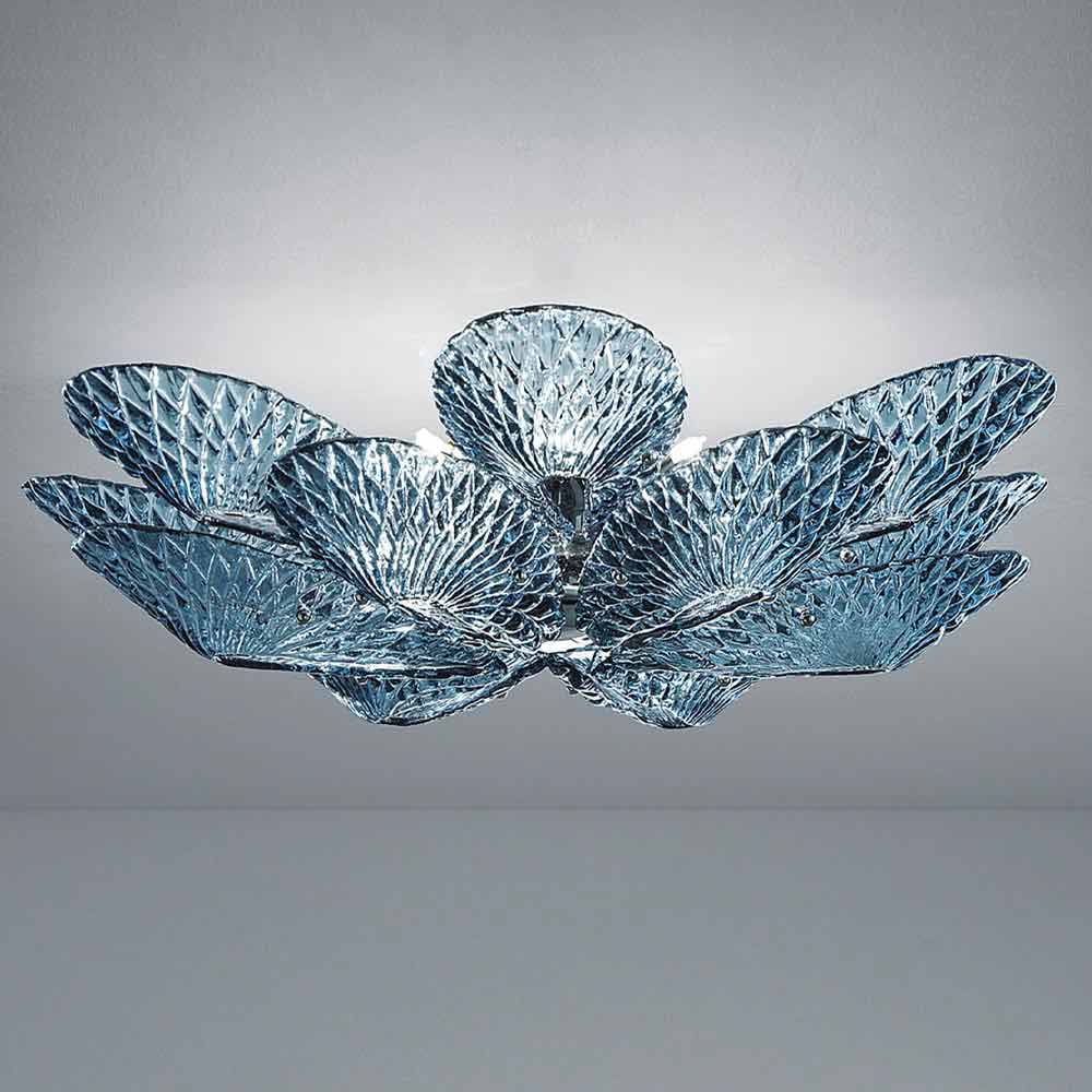 Raffinierte Deckenlampe, handgefertigt in Italien in Venedig aus blauem Glas mit Details aus poliertem verchromtem Metall . Zarte und elegante Glasbänder vereinen sich zu einem leuchtenden Drehpunkt , der sich mit modernen Räumen kombinieren und den klassischsten Umgebungen Charakter verleihen kann. Eine vielseitige Einrichtungslösung, die sich durch das besondere Rautenmuster auszeichnet, das die gesamte Fläche bedeckt und mehrere Blitze für ungewöhnliche und exklusive Lichtspiele erzeugt.