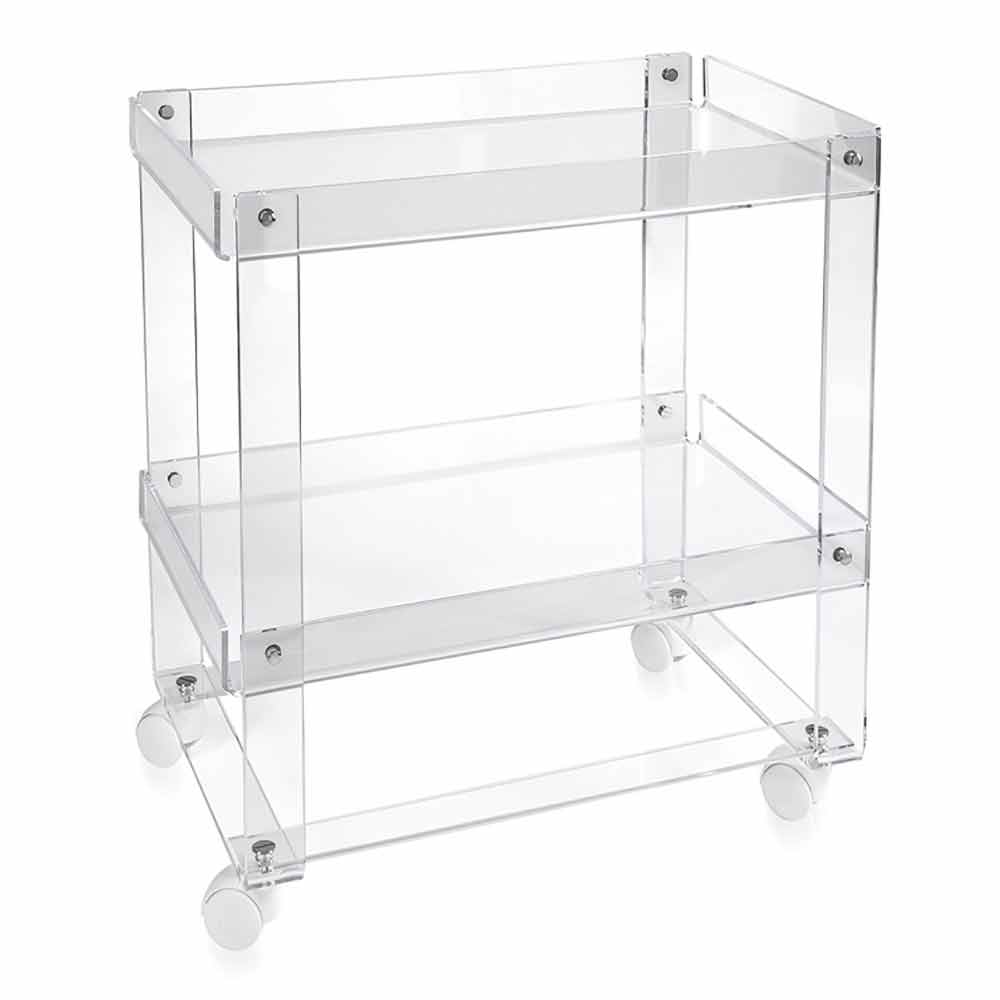 Praktischer und vielseitiger Servierwagen aus Plexiglas, das zu 100% aus unbehandeltem Polymer besteht und durch zwei Einlegeböden als zusätzlicher Servierwagen im Wohnbereich sehr nützlich ist.