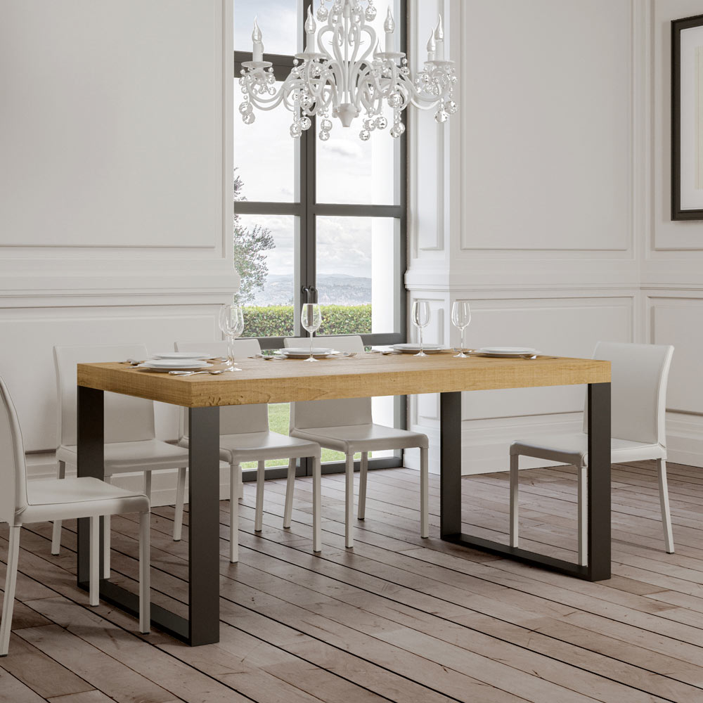 Entdecke die Essenz des Designs mit diesem ausziehbaren Tisch, ein Meisterwerk an Flexibilität und Stil. Die robuste Eisenstruktur harmoniert wunderbar mit der Holzplatte, eine Kombination, die jedem Raum einen Hauch von moderner Eleganz verleiht.