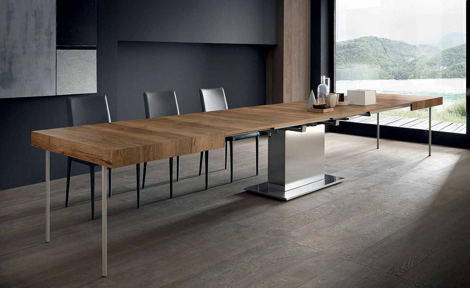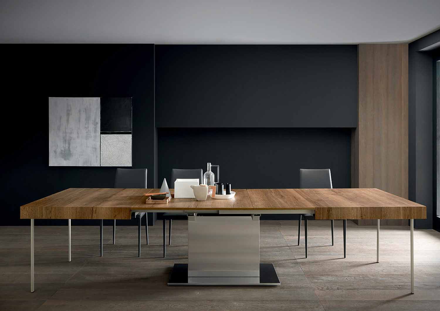 ausziehbare Tisch zeichnet sich durch ein kleines und dezentes Design für die Wohnzimmerversion aus, das jedoch in der offenen Version zu überraschen und große Emotionen zu wecken weiß.