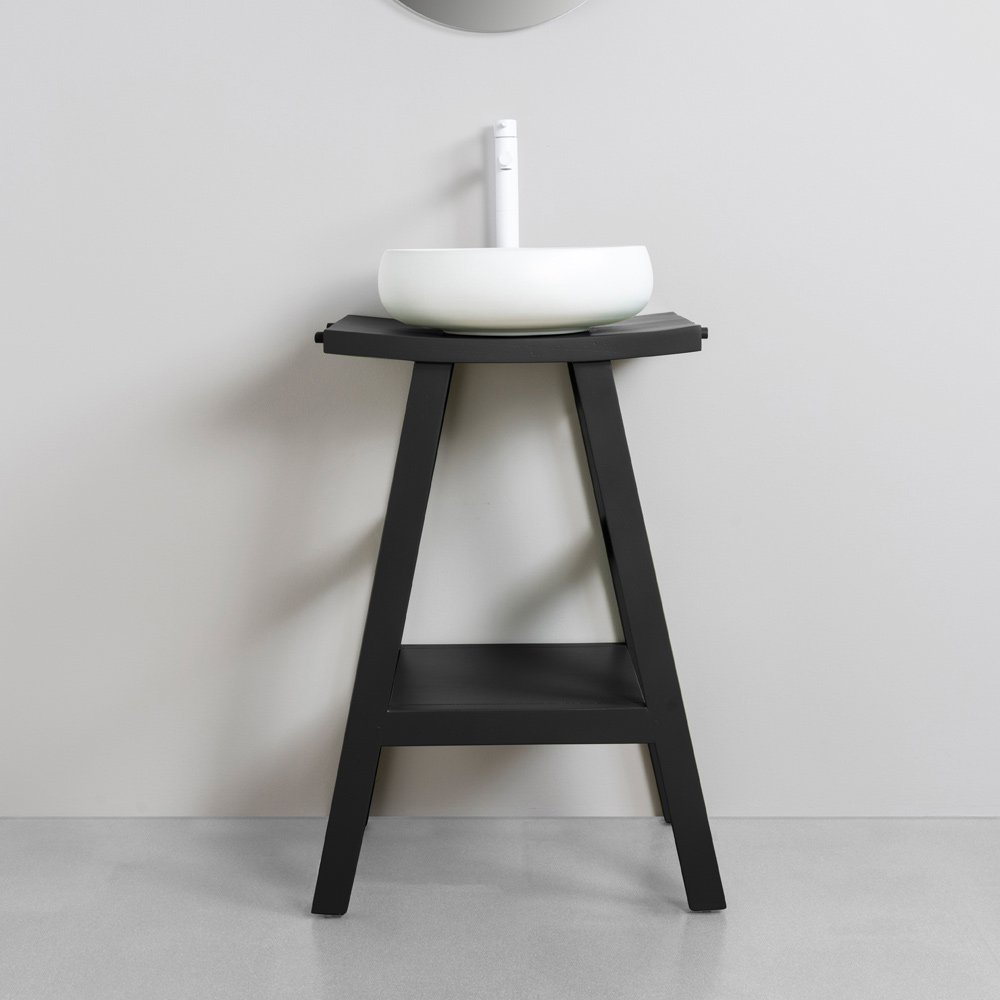 Bodenstehender Badezimmerschrank aus naturbelassenem, schwarz lackiertem Teakholz , eine elegante und stilvolle Farbwahl, die in jeder Einrichtungssituation auffällt, sie faszinierend und geheimnisvoll macht und von exklusiven Atmosphären und einzigartigen Emotionen erzählt. Seine Struktur zeichnet sich durch die leicht geschwungene Form der Platte aus, die der Ästhetik des Produkts eine exklusive und raffinierte Note verleiht. Komplett mit 4 praktischen Handtuchhaken und funktionaler Ablagefläche .