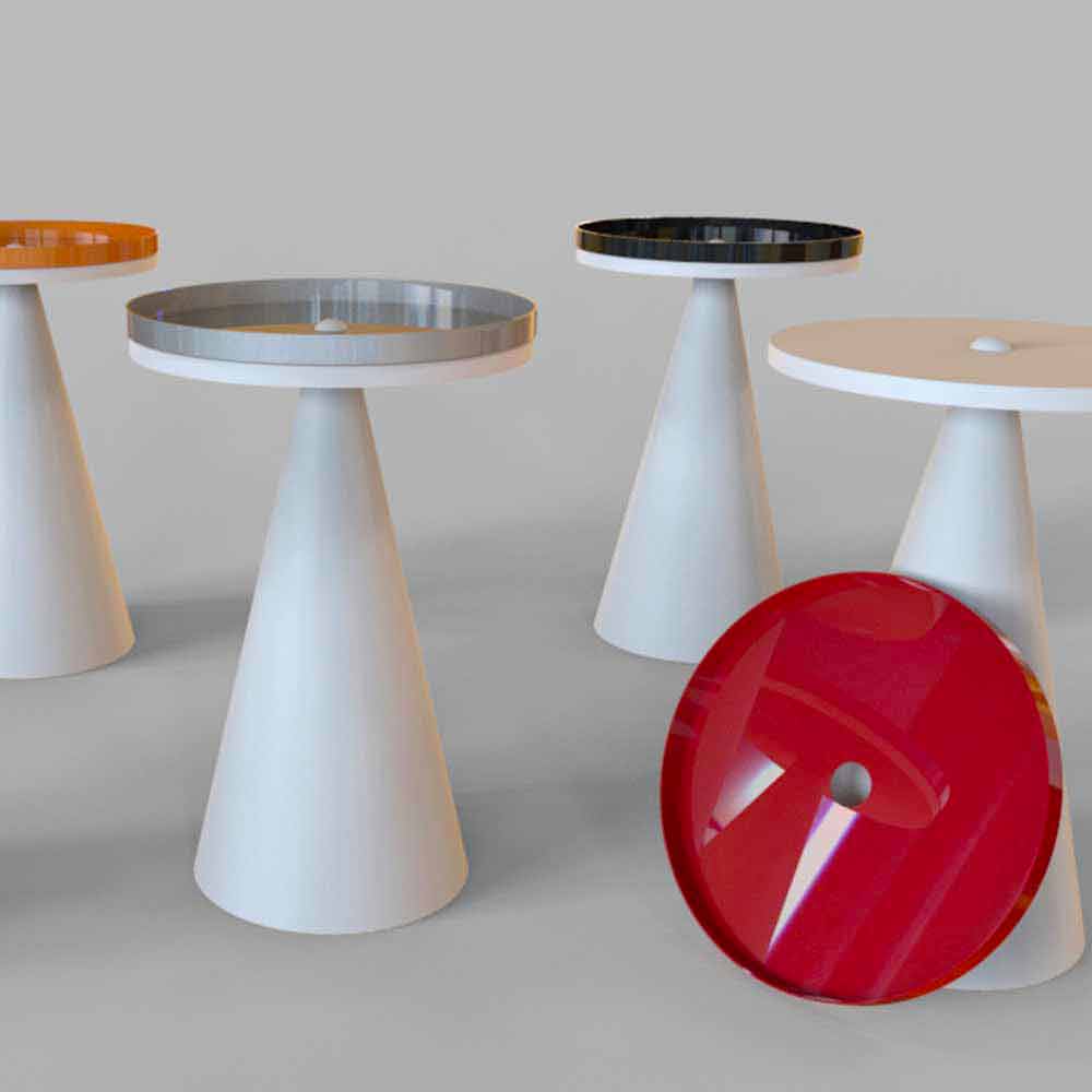 Die Basis aus mattweißem Afamatx kontrastiert mit der oberen Platte aus glänzend lackiertem Blech. Letztere können separat verwendet werden, was die Nutzbarkeit des Tabletts erhöht und gleichzeitig eine doppelte Auflagefläche garantiert.