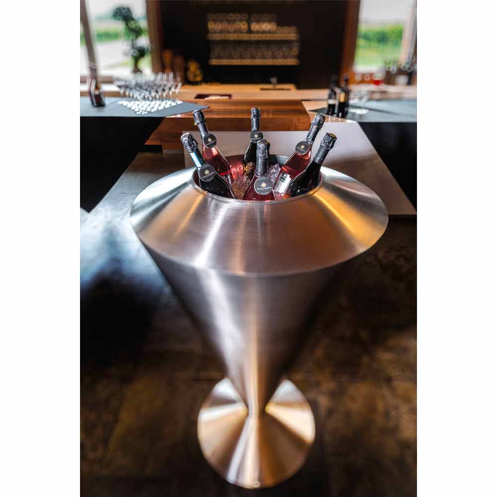 Boden Frappeuse komplett in Italien aus Edelstahl mit Eisflaschenhalter. Ideal für die Einrichtung von Bars, Restaurants, aber auch Wohnräumen, die dem Essen gewidmet sind, ist dieses Möbelstück sowohl modern als auch funktional und bietet eine perfekte Lösung, um die Temperatur der angebotenen Weine kalt zu halten und gleichzeitig die umgebende Einrichtung zu bereichern. Die Verwendung von Stahl maximiert seine Effizienz und ermöglicht es ihm, sich harmonisch und tadellos an jede stilistische Situation anzupassen, um gleichzeitig ein originelles und dezentes Ergebnis zu erzielen. Um seinen Wert zu steigern, ist die 100% Made in Italy Verarbeitung zusammen mit der Verwendung von hochwertigen Rohstoffen , die seinen Wert erhöhen und ein solides, widerstandsfähiges Produkt mit ausgezeichneter Haltbarkeit gewährleisten.