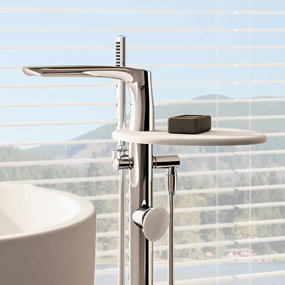 Auf dem Deck montierter Bademischer mit Duplex-Handbrause, Umsteller und Regal aus DuPont ™ Corian® Made in Italy.