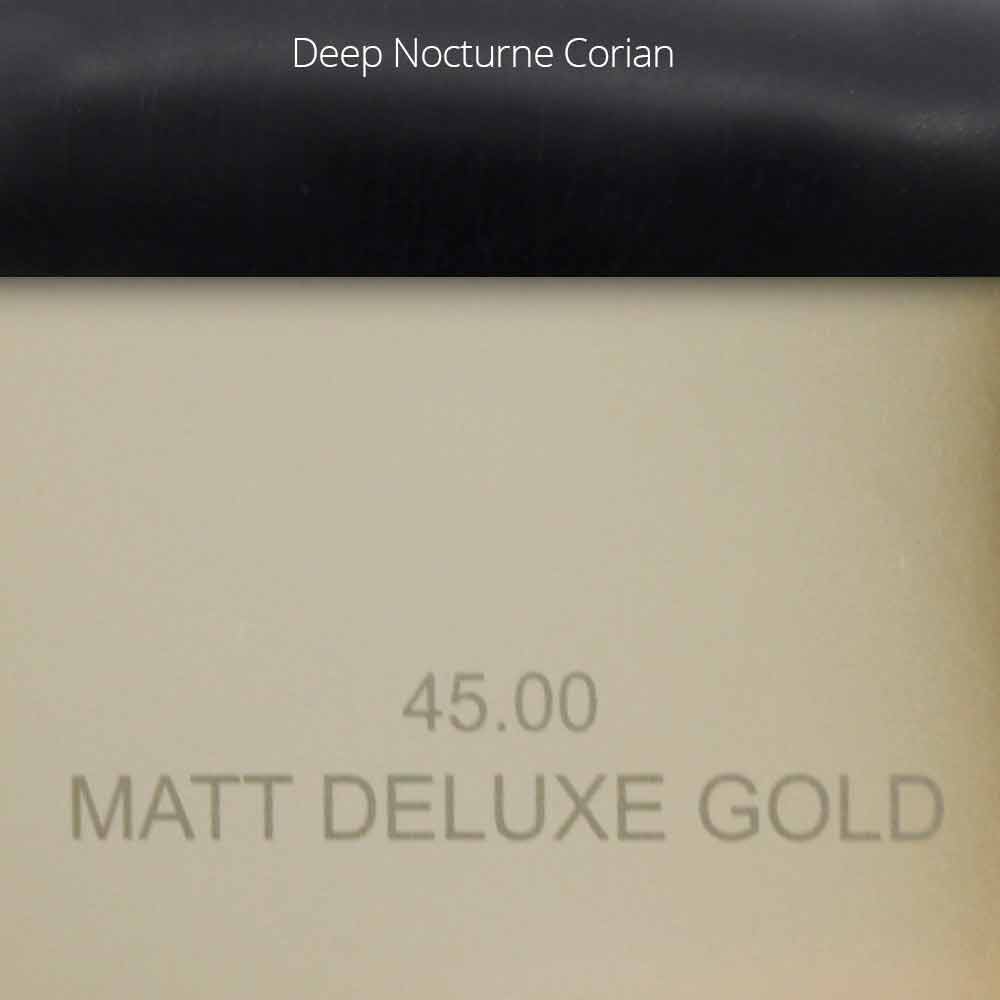 - Matt Deluxe Gold + Deep Nocturne Corian®: Mattes 14-Antik-Gold-Finish mit schwarzen DuPont ™ Corian®-Elementen.