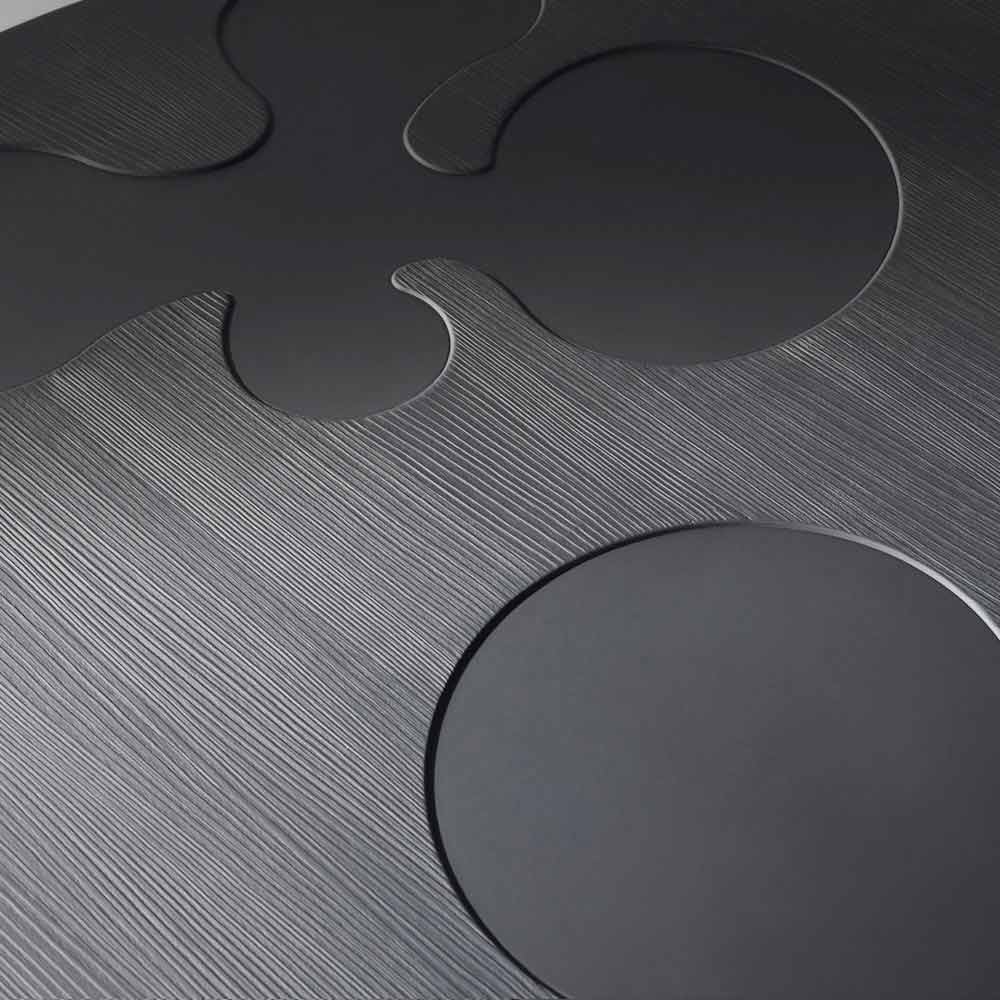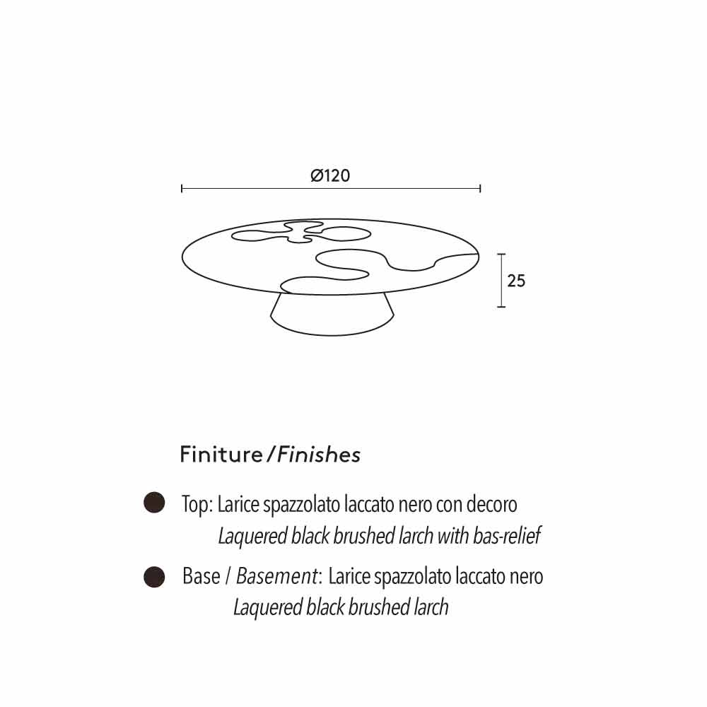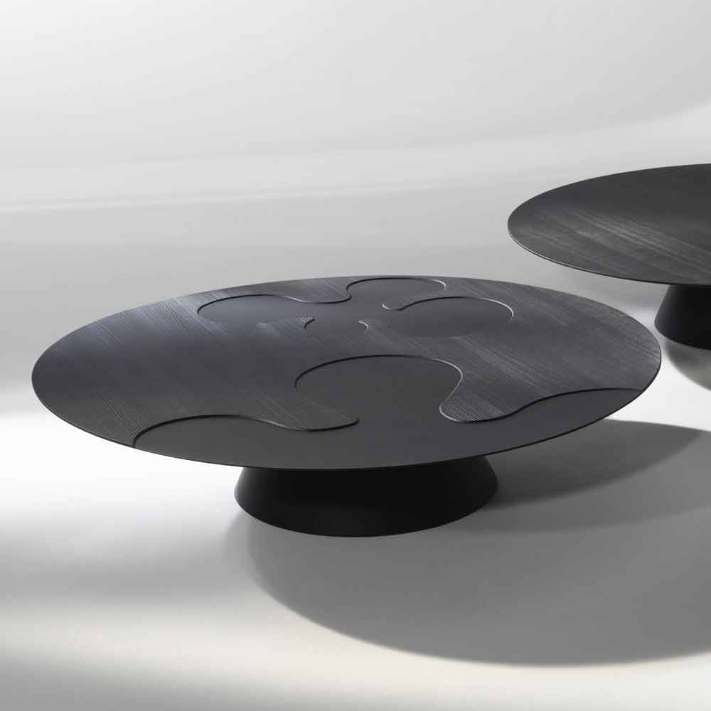 moderner Couchtisch ausgestattet mit einer runden Tischplatte aus gebürsteten Lärchenholz lackiert in der Farbe schwarz matt mit abgeflachte Holzflächen in Musterausführung. Die abgeflachten Holzflächen bestehen aus demselben Material wie die Tischplatte, sind jedoch einige Zentimeter abgeflacht. Die Ausführung der kompletten Tischplatte besteht aus Thermoholz; Holzart Lärche.