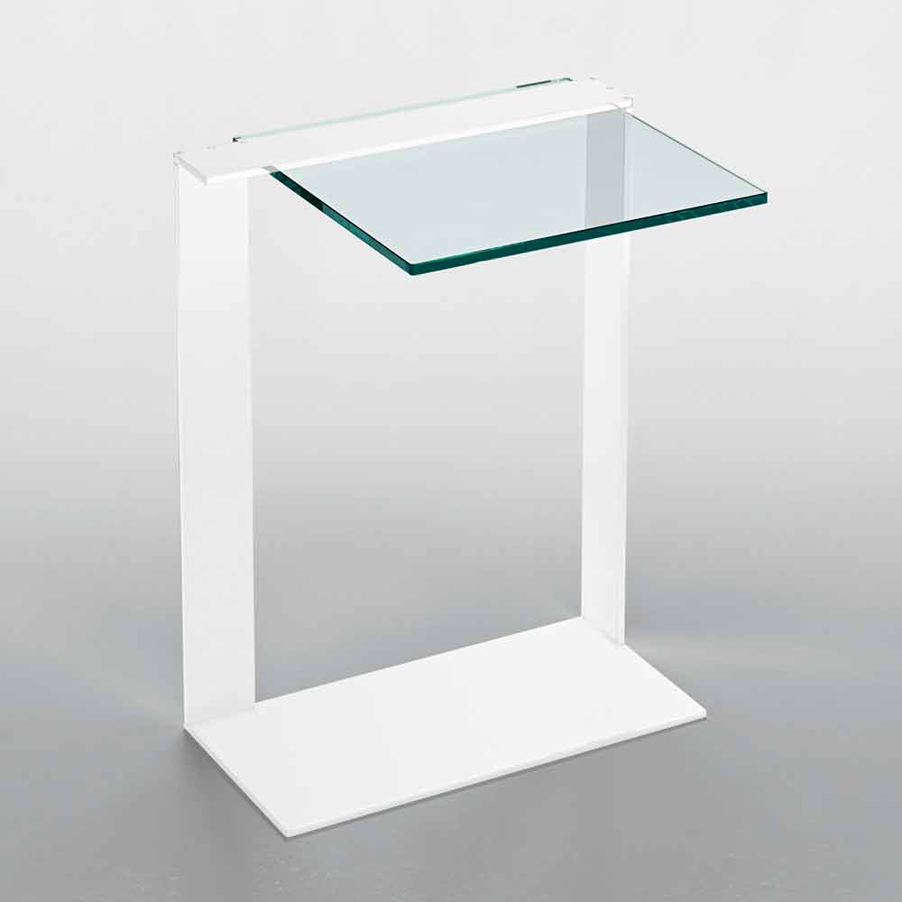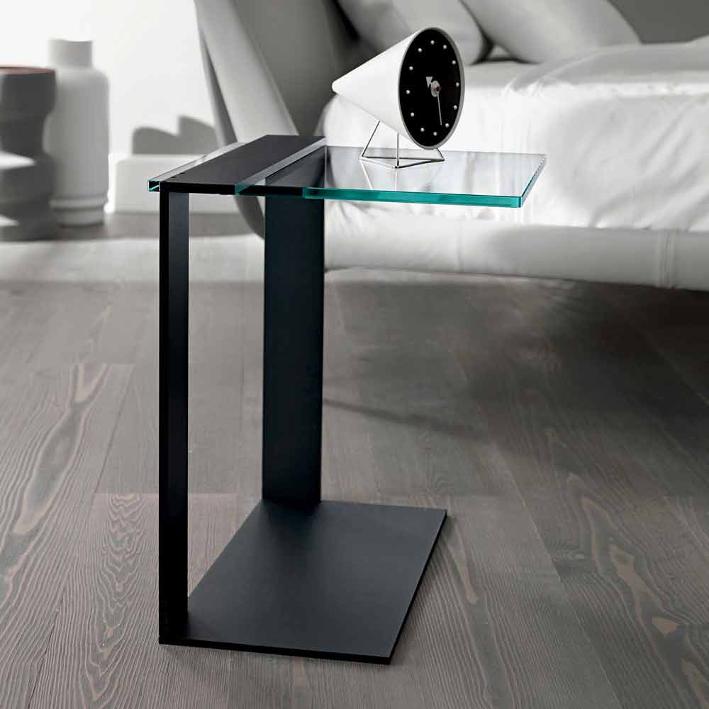 Couchtisch im modernen Design mit Metallfuß und extra klarer oder geräucherter Glasplatte, handgefertigt in Italien.