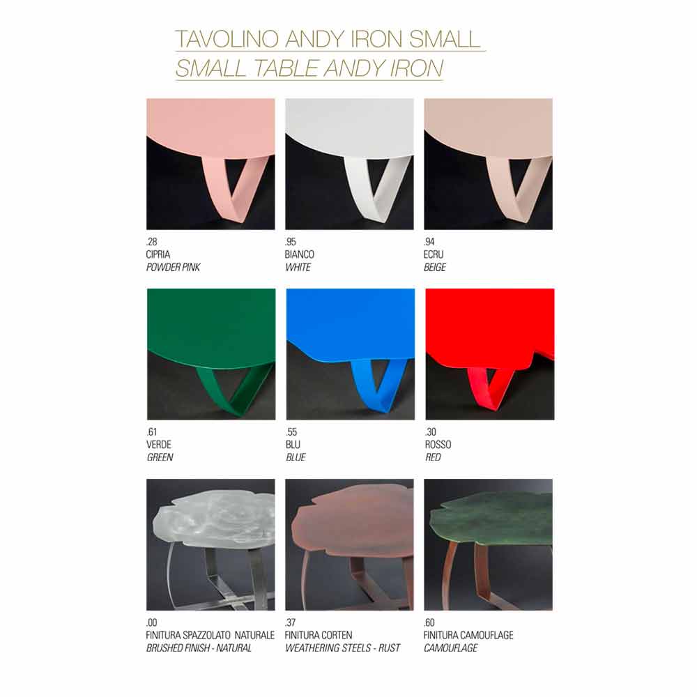 Der Tisch ist komplett aus Metall mit Laserschnitt hergestellt. Die Tischbasis ist in derselben Farbe der Tischplattte lackiert, mit Ausnahme von dem Camouflage Modell.