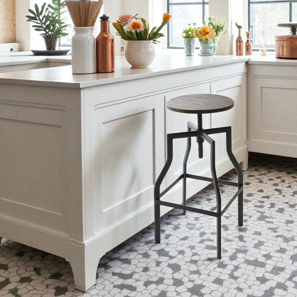 Der Hocker besticht durch sein industriell schwarz lackiertes Metallgestell und die höhenverstellbare Sitzfläche aus Walnussholz, die bis zu einer maximalen Höhe von 76 cm verstellbar ist. Mit diesem Hocker vereinen Sie Stil und Komfort auf höchstem Niveau.