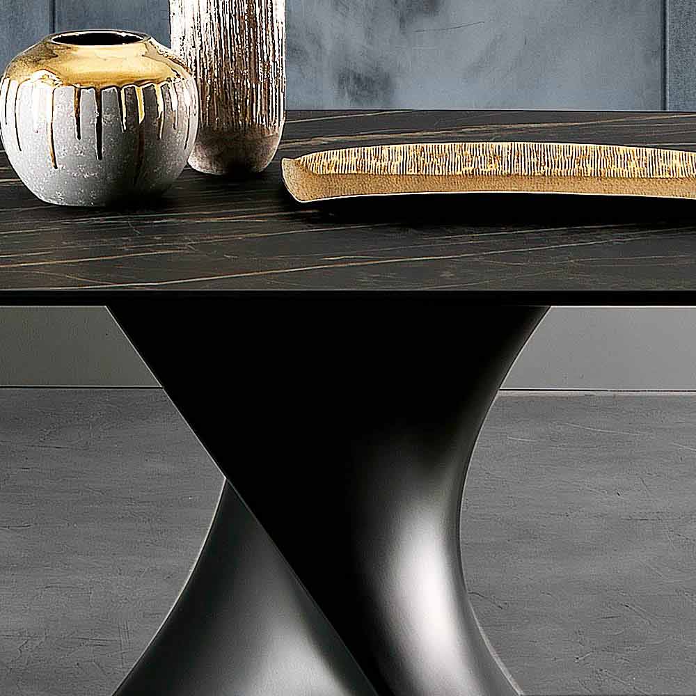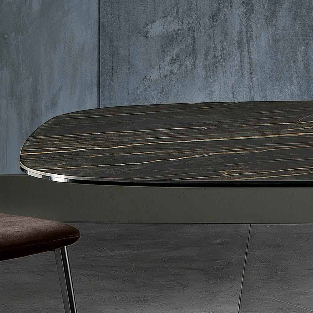 Clark ist ein in Italien hergestellter fester Tisch mit einer ovalen Oberfläche aus Glaskeramik und einem Polyurethansockel.