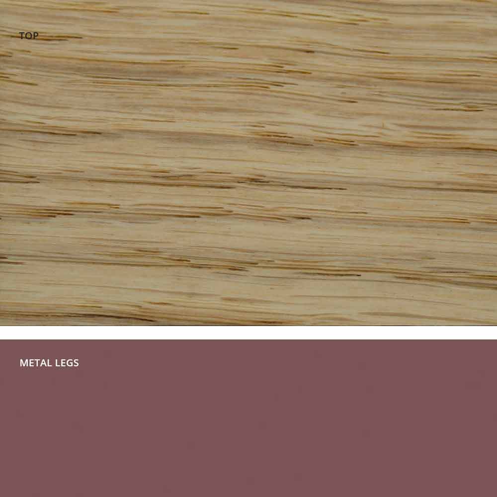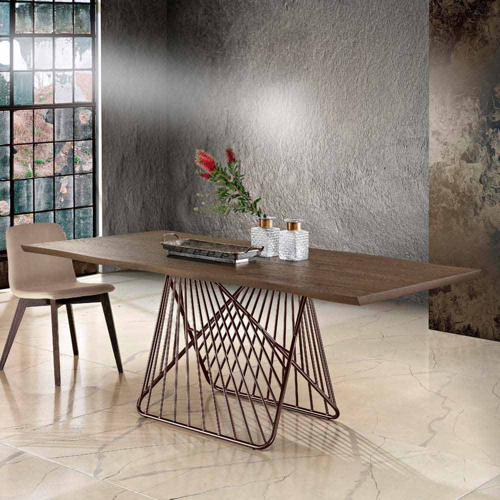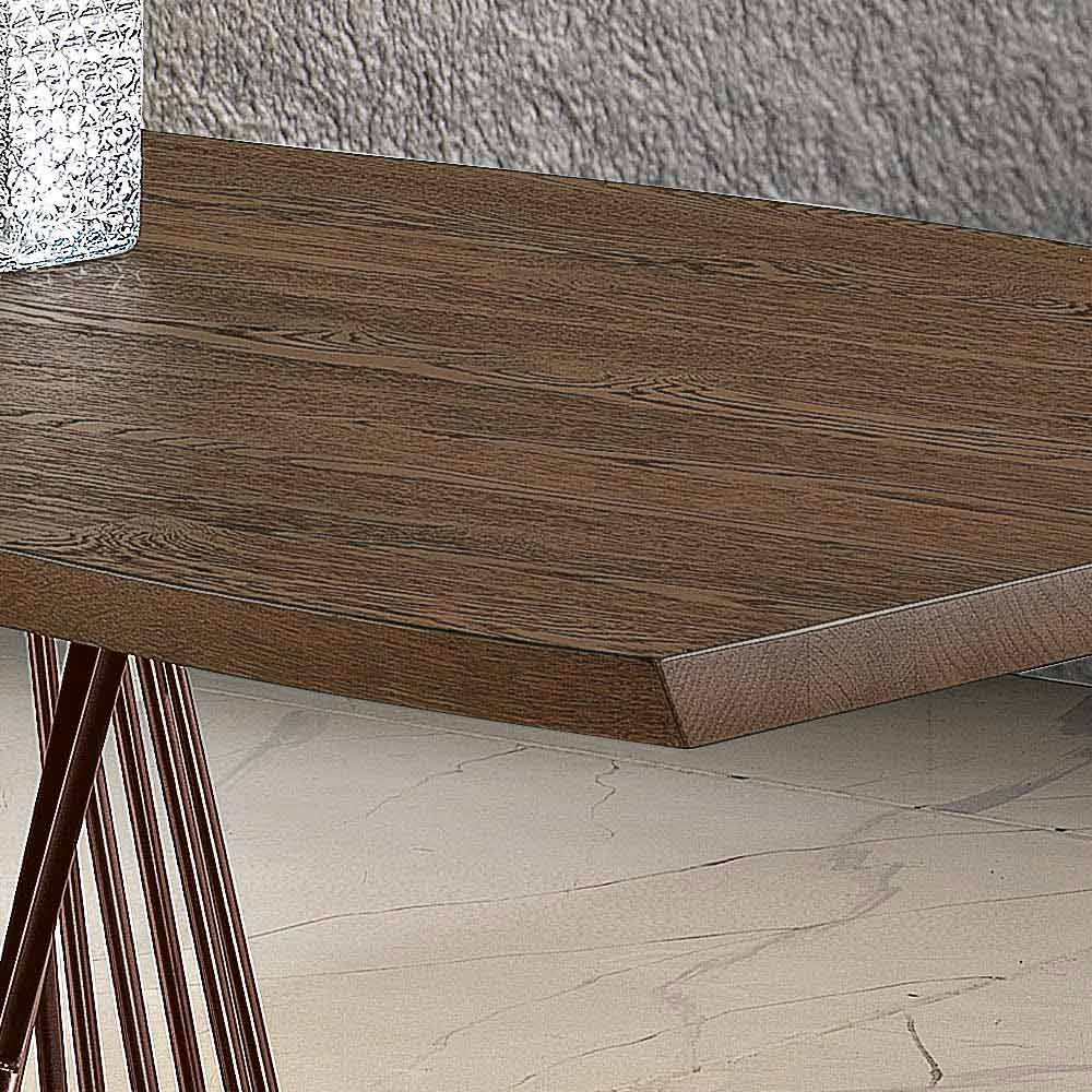 Mitia ist ein in Italien gefertigter fester Tisch mit lackiertem Metallfuß und einer massiven Holzpartikeloberfläche (Dicke 35 mm), die an den Längsseiten furniert ist.