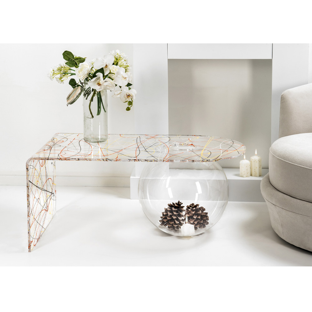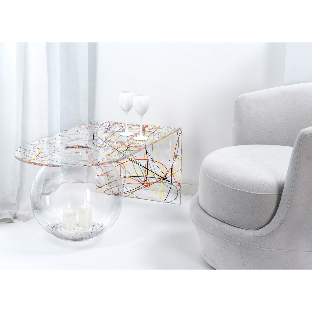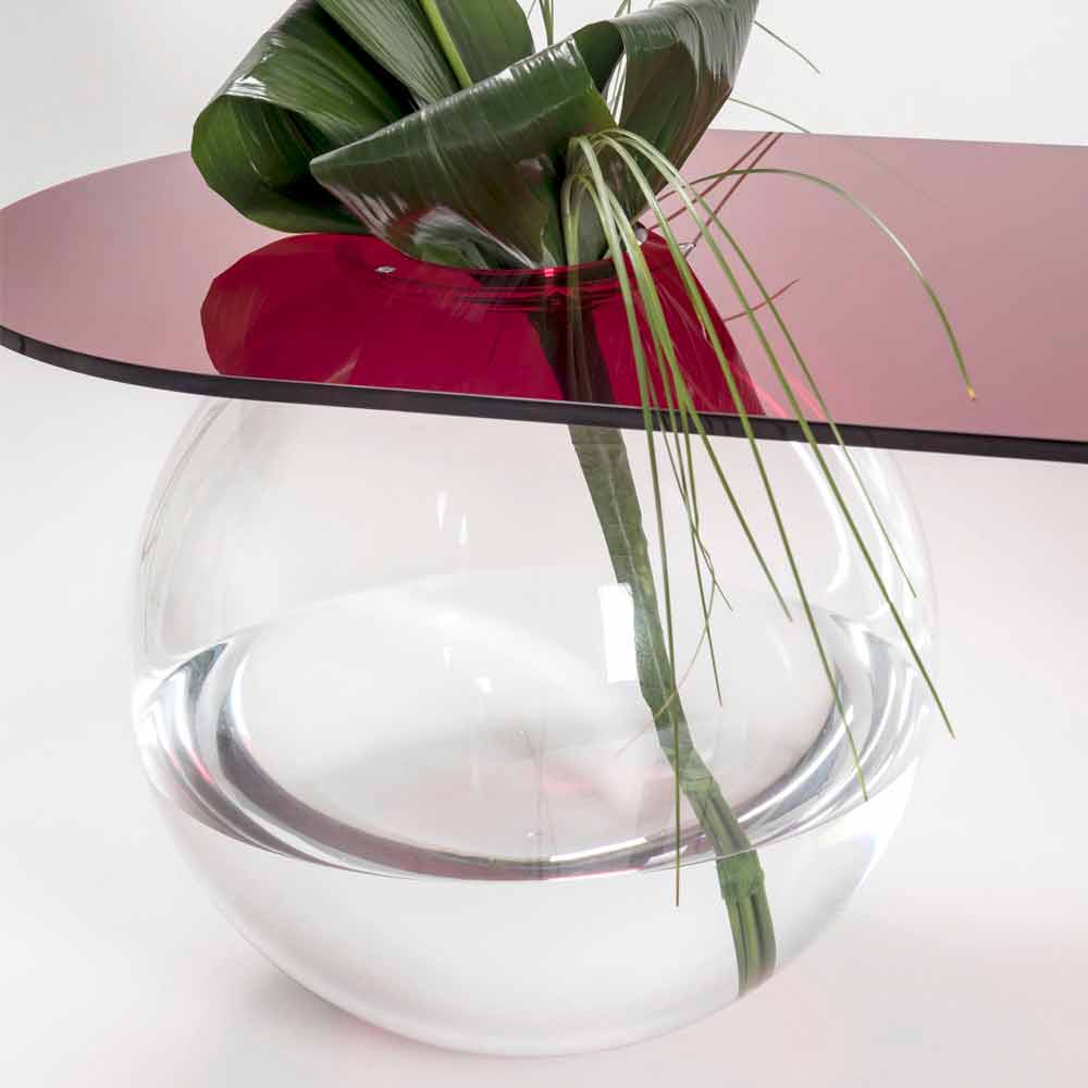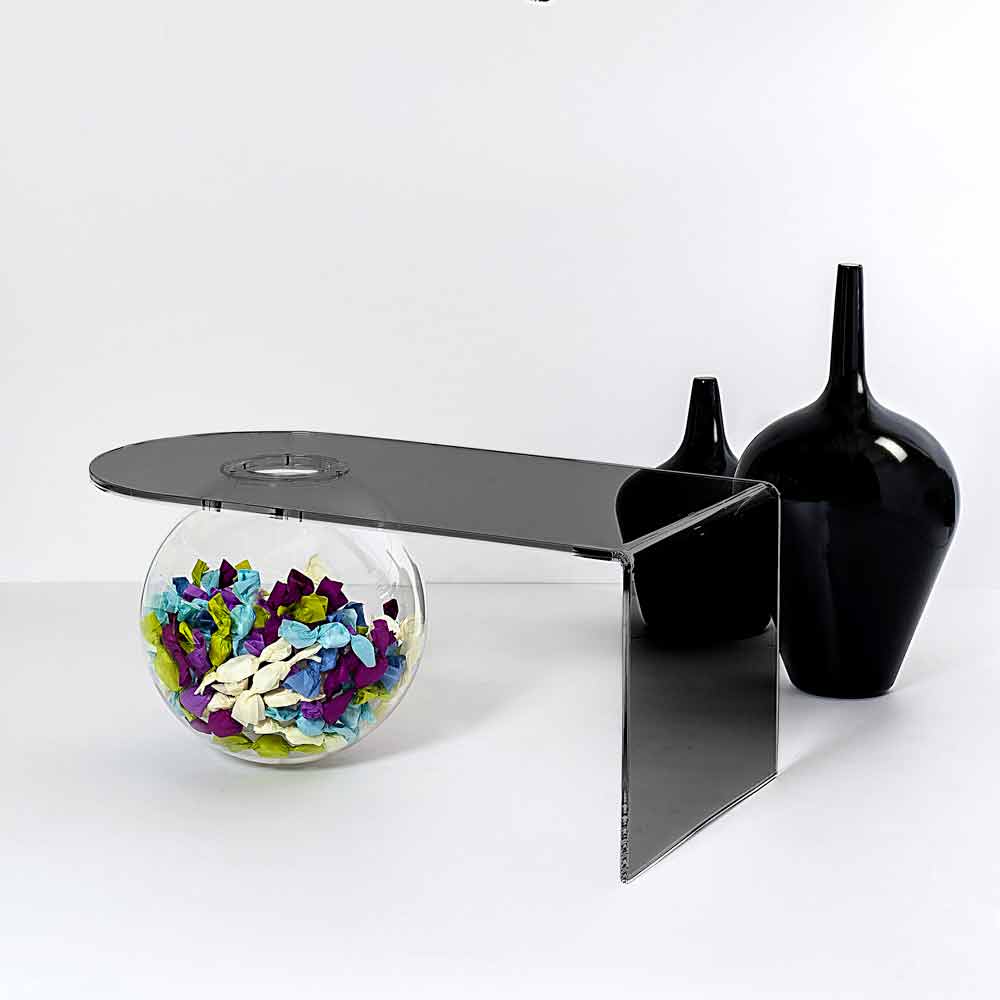 Bolly Wohnzimmer Plexiglas Couchtisch, hergestellt in Italien Bolly ist ein gebogener Tisch, der in Italien aus 100% jungfräulichem Polymer-PMMA-Plexiglas gefertigt und mit Laser geschnitten, bei hohen Temperaturen thermogeformt und zu einer sphärischen Struktur zusammengebaut wurde, die als Blumenvase, Aquarium oder einfach als Behälter verwendet werden kann.