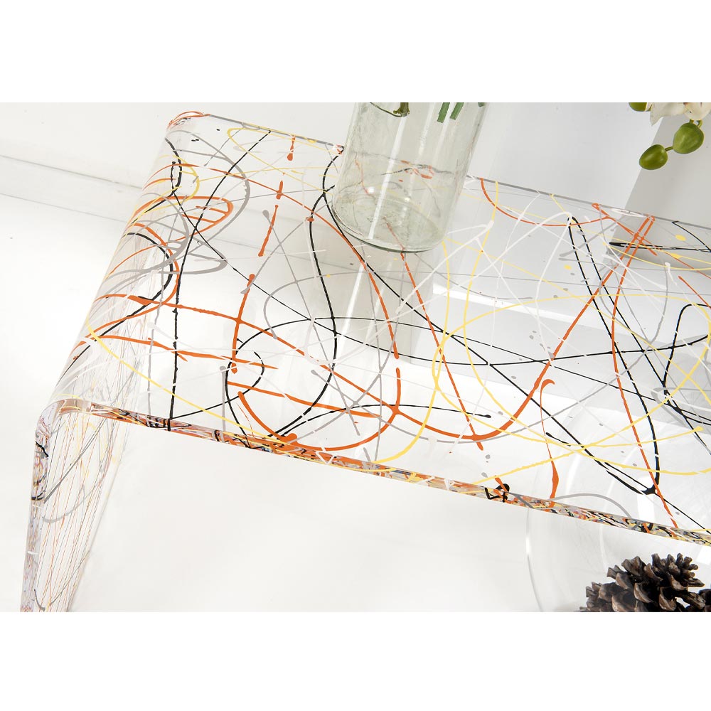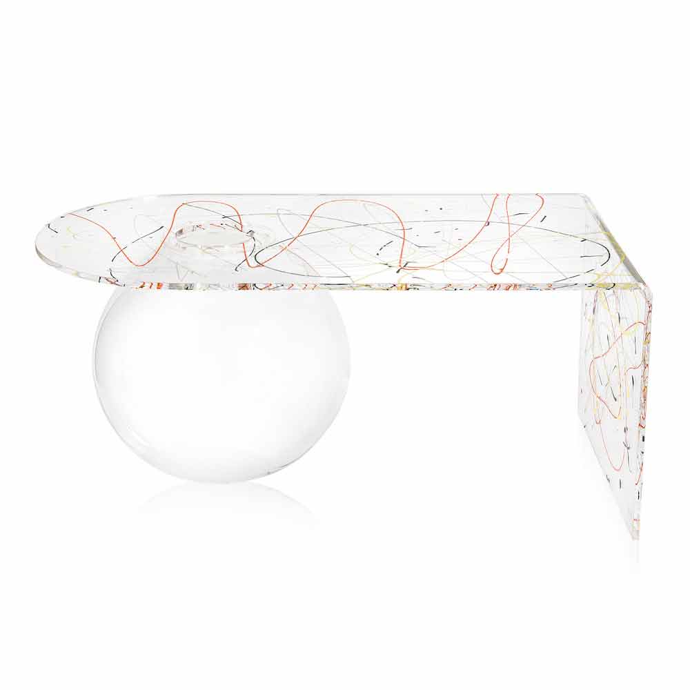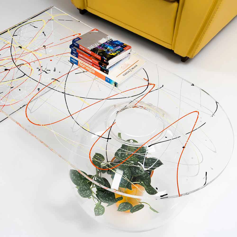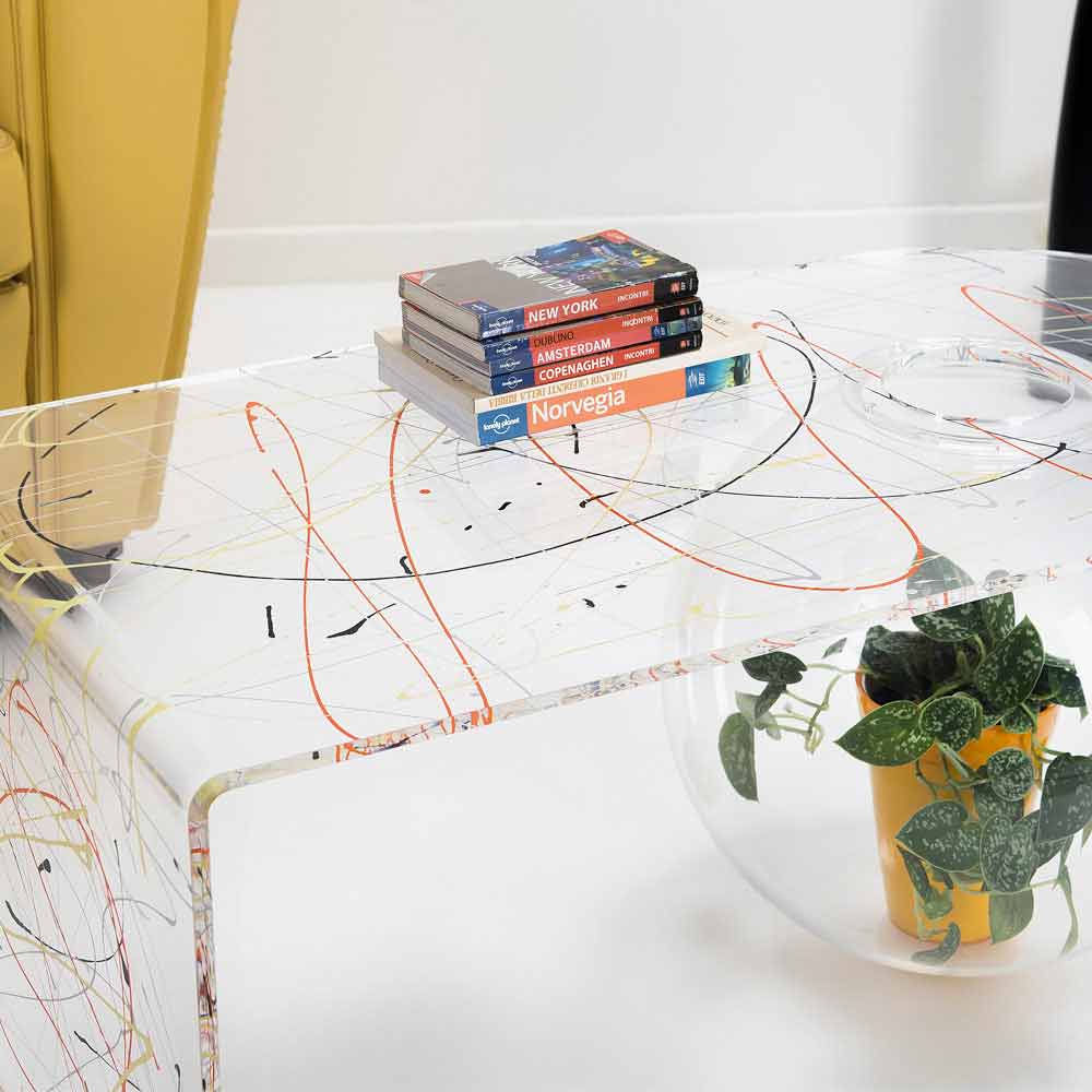 Bolly Wohnzimmer Plexiglas Couchtisch, hergestellt in Italien Bolly ist ein gebogener Tisch, der in Italien aus 100% jungfräulichem Polymer-PMMA-Plexiglas gefertigt und mit Laser geschnitten, bei hohen Temperaturen thermogeformt und zu einer sphärischen Struktur zusammengebaut wurde, die als Blumenvase, Aquarium oder einfach als Behälter verwendet werden kann.