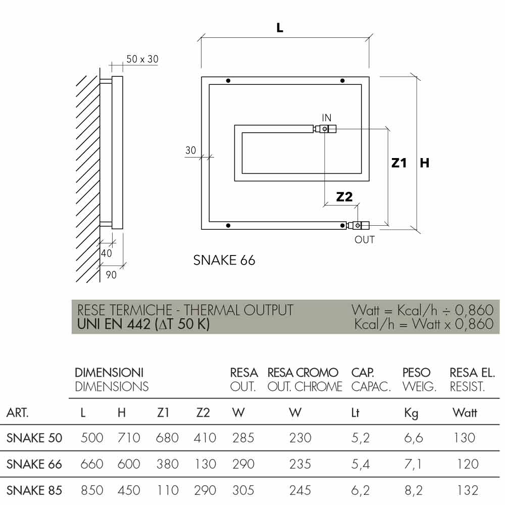 | Maße | L.660 mm, H.600 mm, Achsabstand1 380 mm, Achsabstand2 130 mm, Wärmeausbeute 290 Watt, Kapazität 5,4 Lt, Gewicht 7,1 kg |