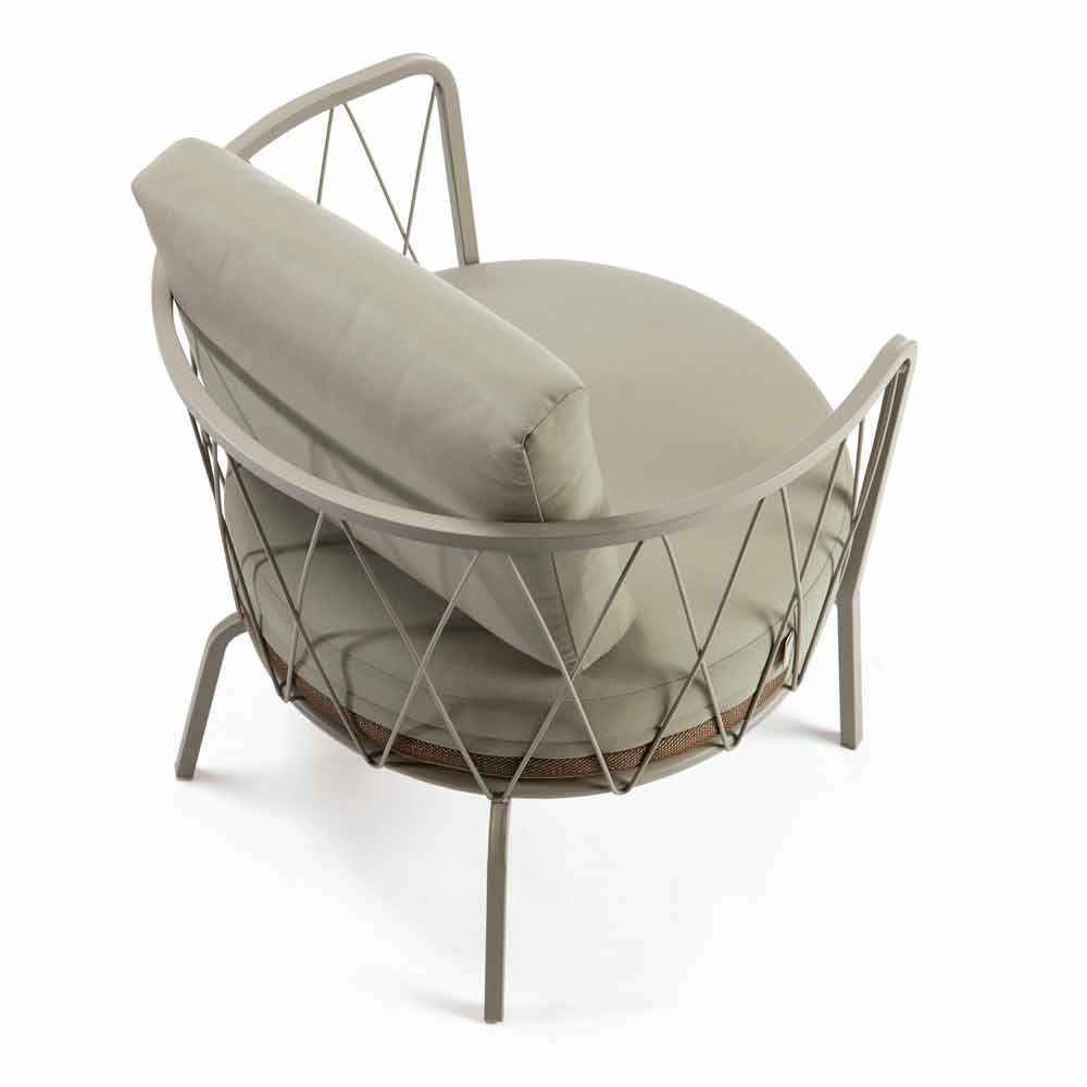 hoher Komfort erhalten bleiben. Dank des modernen Designs und des Komforts der Kissen, die mit 100 % gefärbtem, flecken-, schimmel- und lichtbeständigem Acrylgewebe bezogen sind, eignet sich dieser Sessel ideal für private Umgebungen wie Gärten und Terrassen, aber auch für Bars und Restaurants, wo sie Persönlichkeit verleihen.