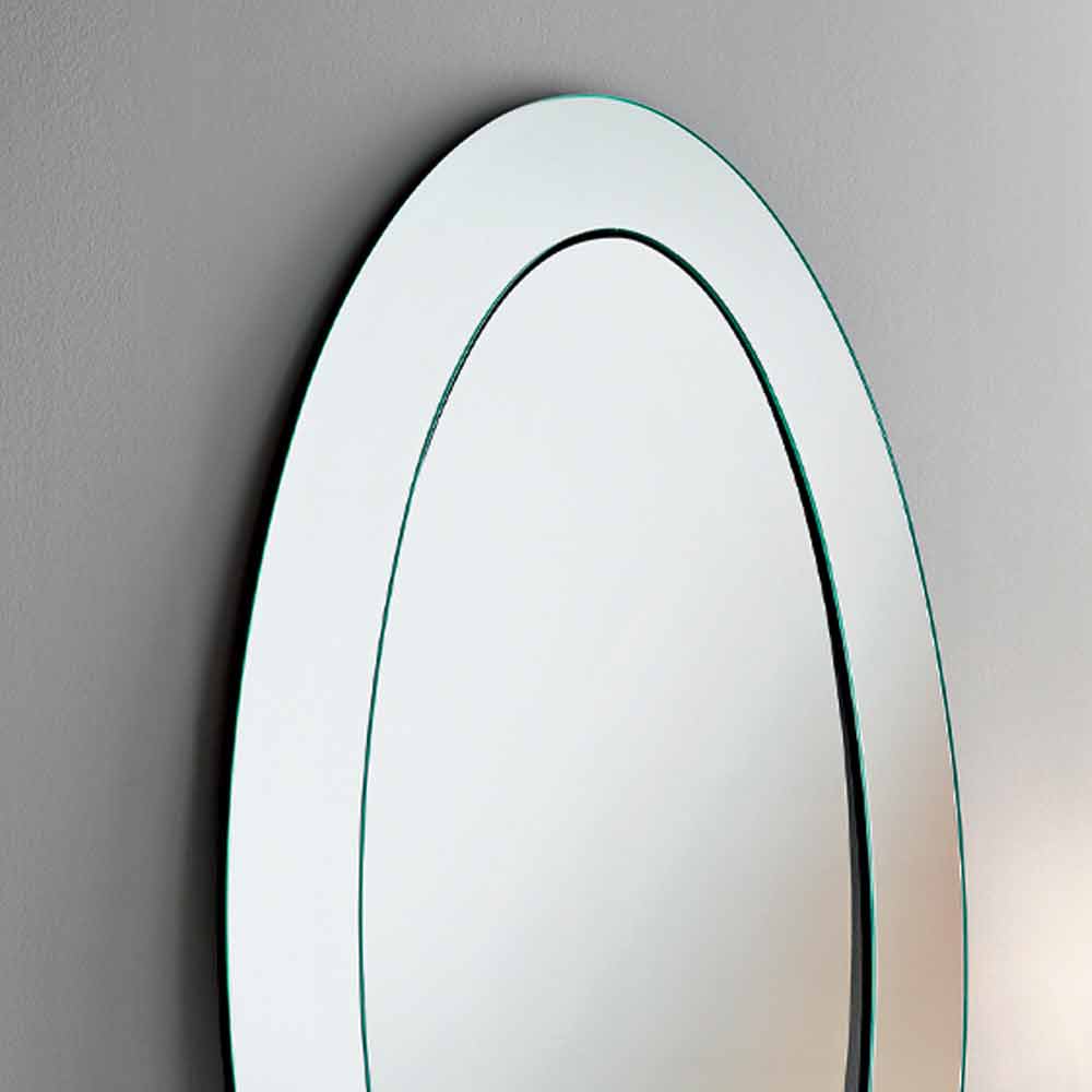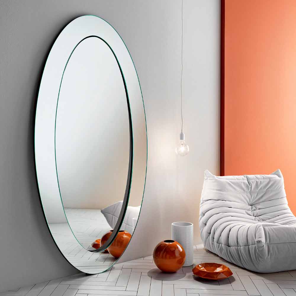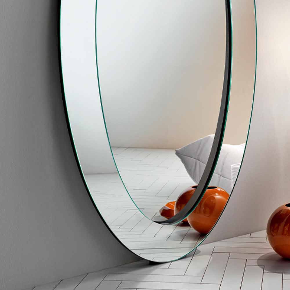 Ovaler freistehender Spiegel im modernen Stil mit geneigtem Rahmen, in Italien von Hand realisiert.