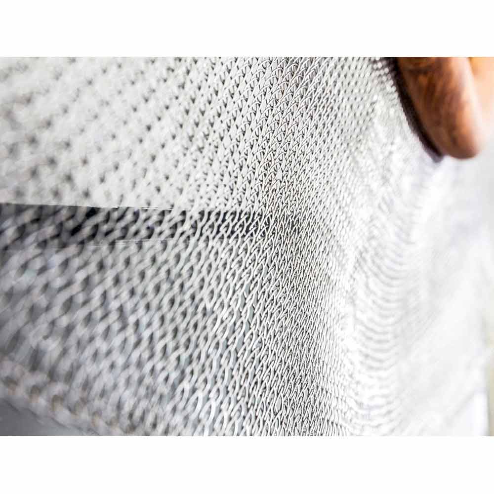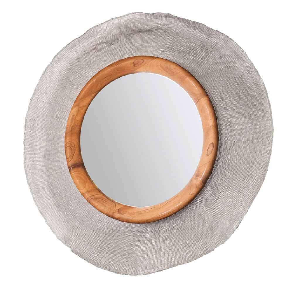 Hergestellt aus einem handgewebten Metallgewebe und entlang des polierten Teakholzrahmens des Spiegels angebracht; das Drahtgeflecht kann nach Belieben geformt werden.