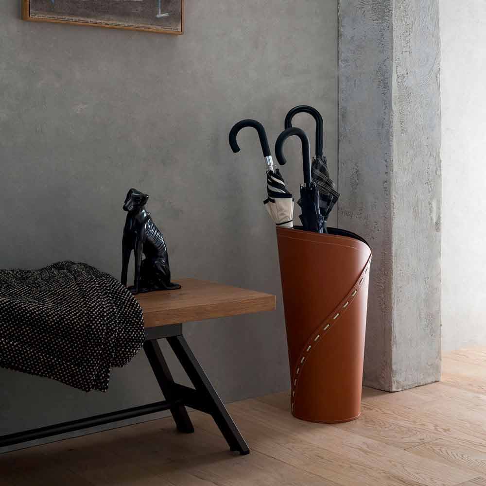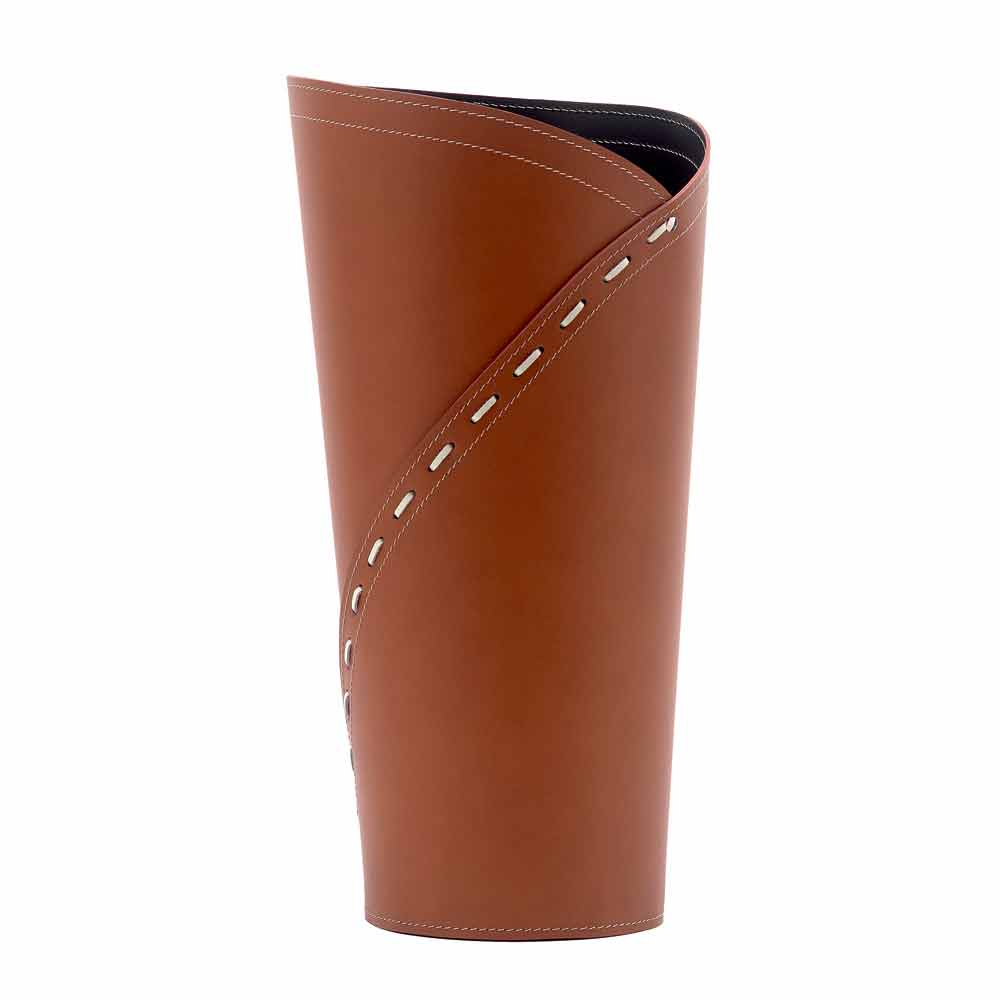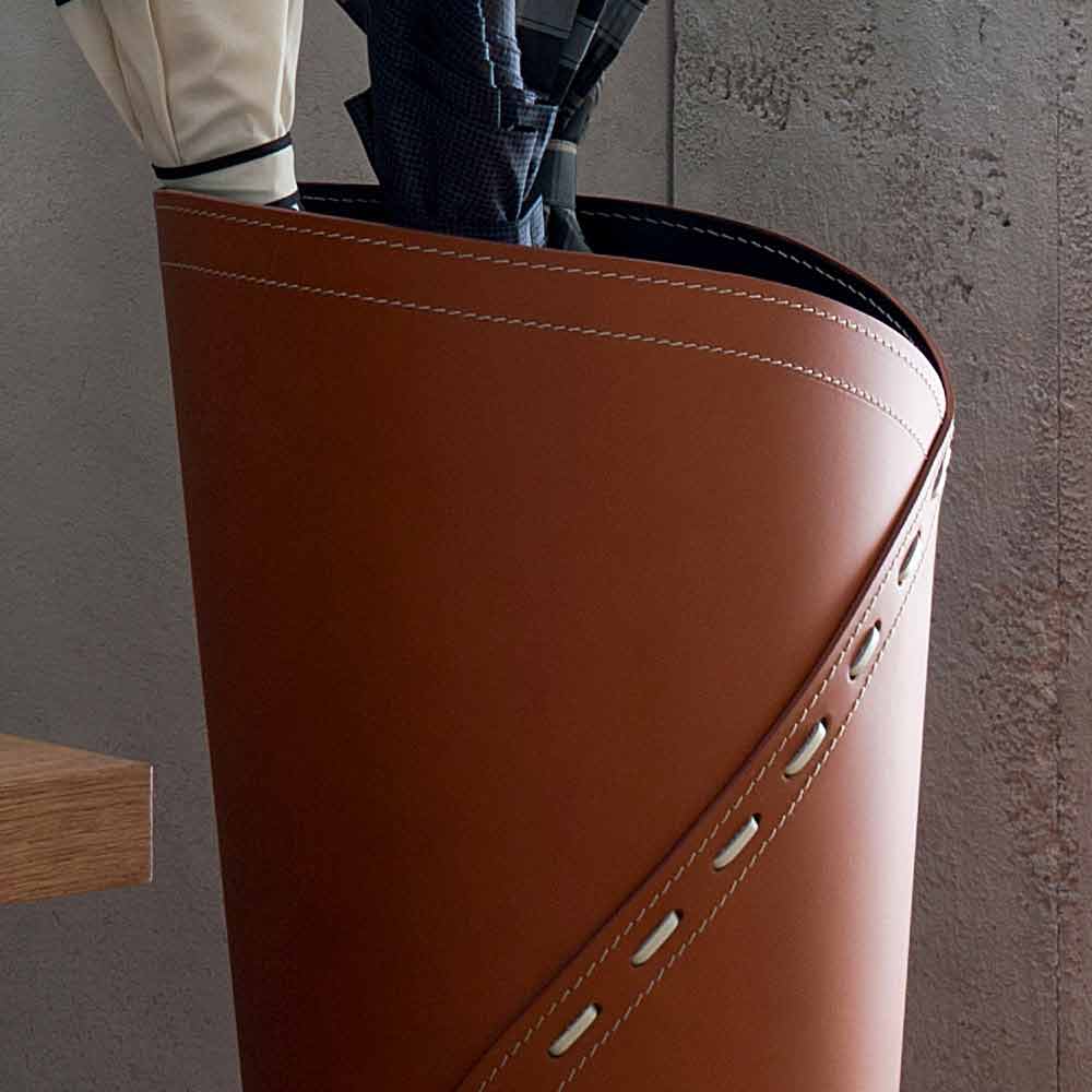 Der Schirmständer Katrina besteht aus regeneriertem Leder, das sowohl die äußeren als auch die inneren Oberflächen bedeckt. Die sichtbare Naht ist ein elegantes Detail, das dazu beiträgt, einer rein funktionalen Ergänzung einen dekorativen Wert zu verleihen.