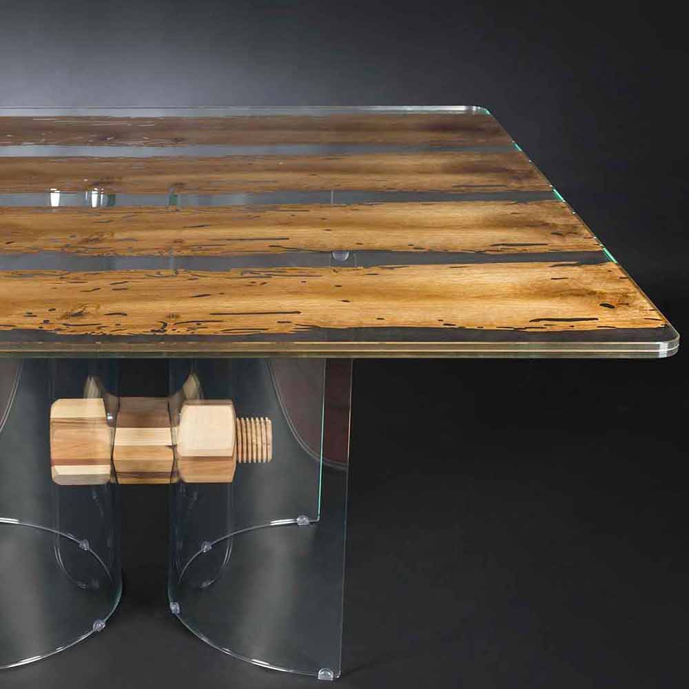 Der Tisch Venezia besteht aus zwei Glasschichten 10+10 mm. Dazwischen liegt ein Blatt aus veraltetem Briccola Holz.