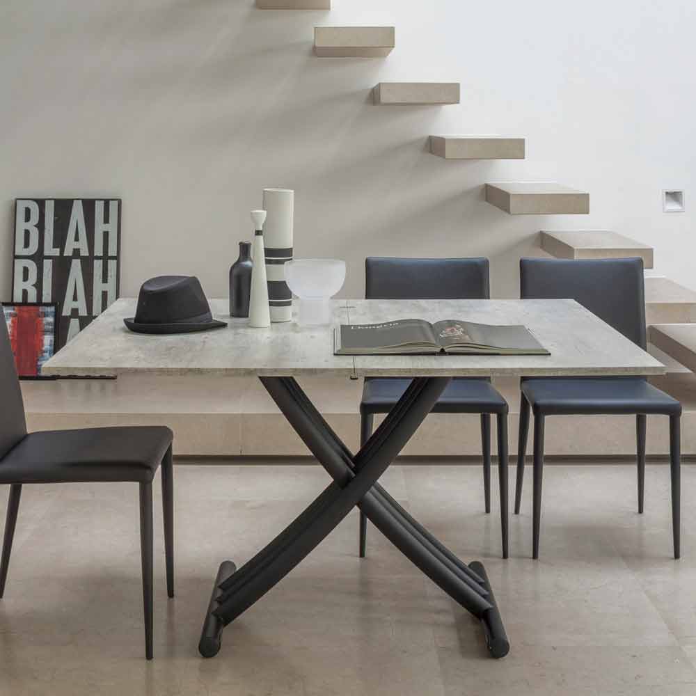 Verwandelbarer Couchtisch aus Metall und Holzplatte made in Italy.