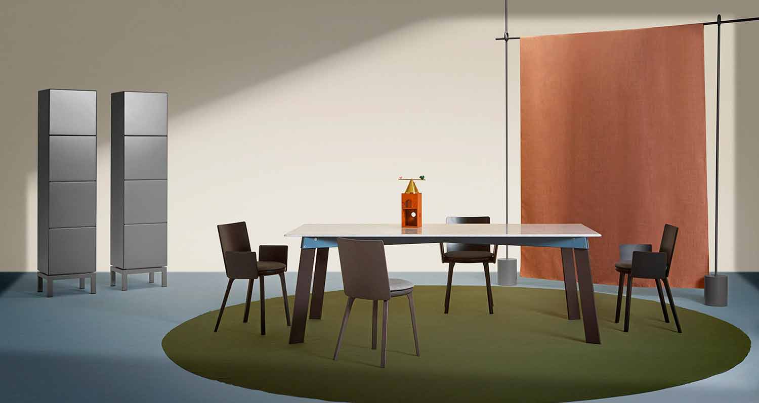 Das originelle und funktionelle Gabeldesign der Stahlenden ermöglicht das Einsetzen der Beine, auch aus Stahl, mit einem einfachen Montagesystem. Ein technisches und praktisches Detail, das auch ästhetisch wird: Die Verbindungsschrauben und die Wahl passender oder kontrastierender Farben heben es hervor und schaffen einen