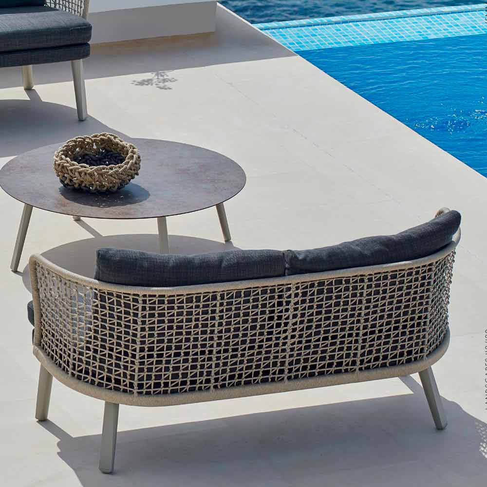 Emma ist ein fantastisches Gartensofa, der sich durch eine syntaktische Faserstruktur auszeichnet, die von Hand gewebt wird, mit einem pulverbeschichteten Aluminiumrahmen in beige lackiert.