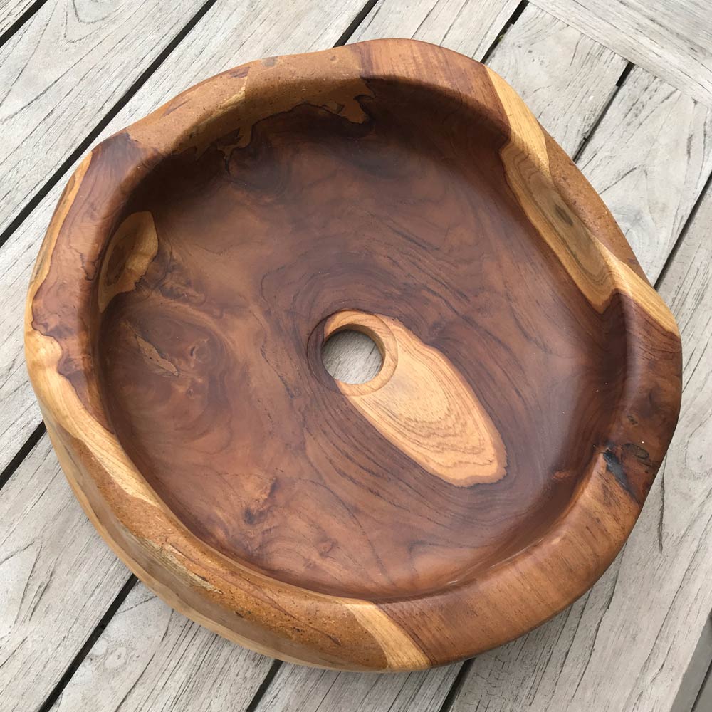 Natürliches und poliertes Teakholz in einer essentiellen und praktischen Form. Unbehandeltes Holz gibt die Düfte und Farben tropischer Wälder zurück. Aufsatzwaschbecken aus glattem und naturbelassenem Teakholz.