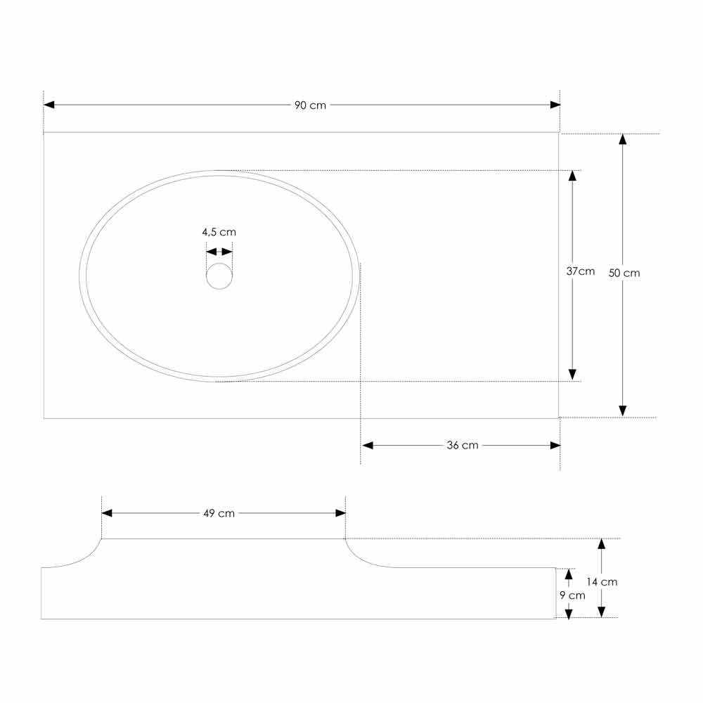 - eine Hängeplatte aus weißem Istone Mineralwerkstoff mit integriertem Waschbecken mit 90 x 50 x 10 cm Ablaufabdeckung (mit Überlaufsystem);